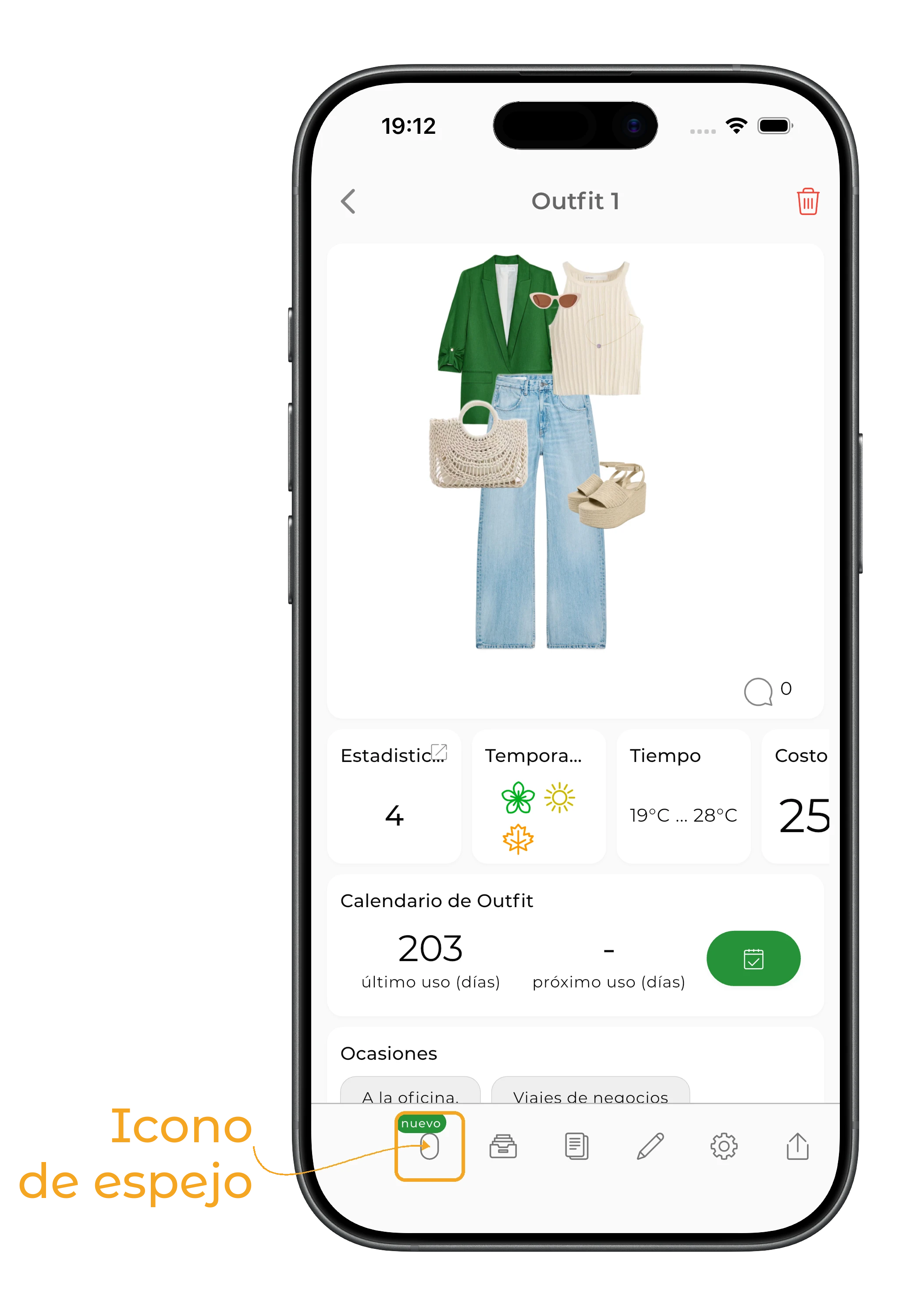¿Cómo pruebo outfits virtualmente en GetWardrobe? Abre cualquier outfit, pulsa el icono de Espejo, elige un fondo (predefinido o propio) y pulsa Iniciar probador virtual. La IA coloca el outfit sobre tu foto en segundos para que puedas previsualizar el look antes de ponértelo, y después guardar o compartir el resultado.
