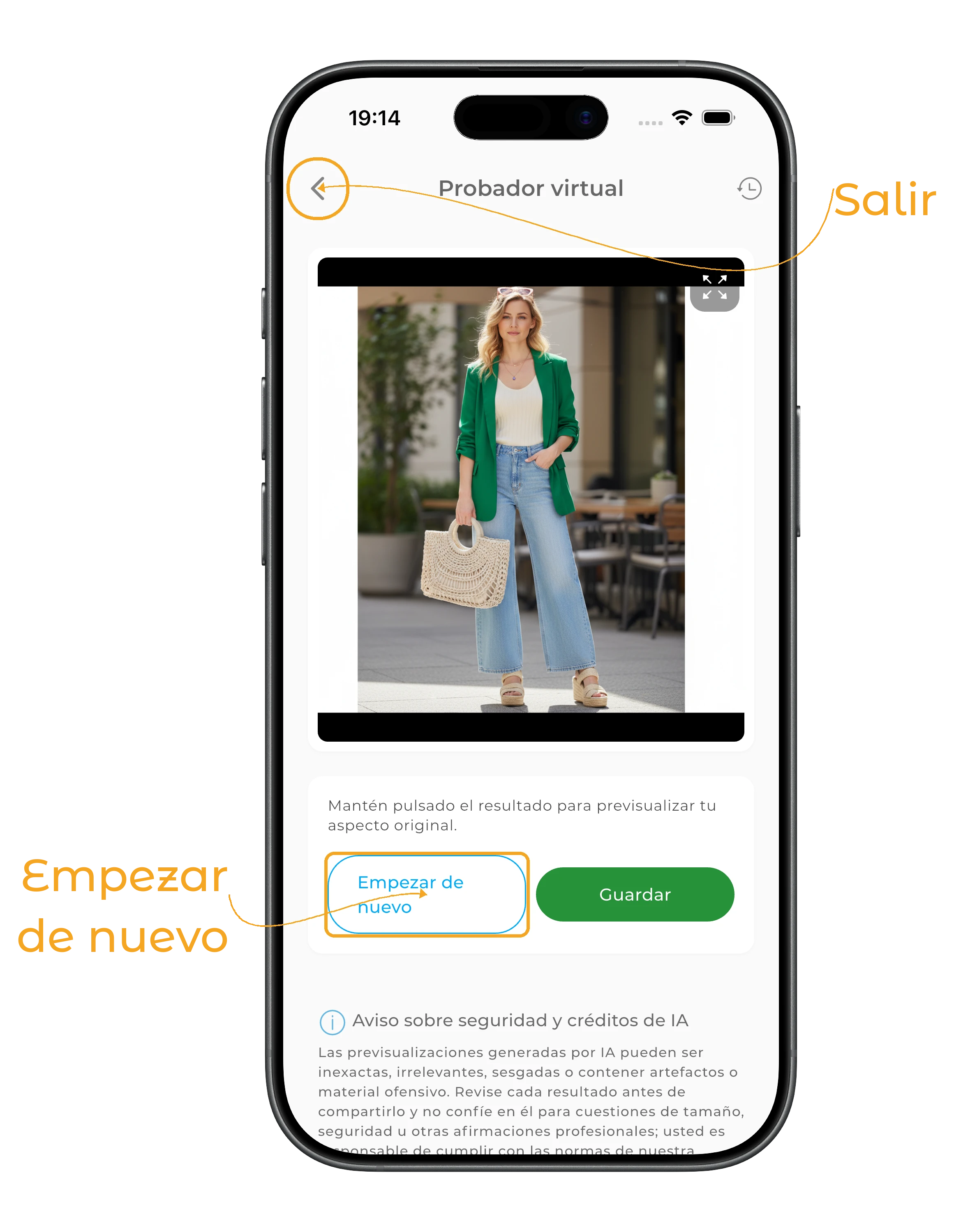 ¿Quieres probar otro fondo o crear un look nuevo? Pulsa Empezar de nuevo. Para salir del Probador virtual, pulsa la flecha de la esquina superior izquierda.