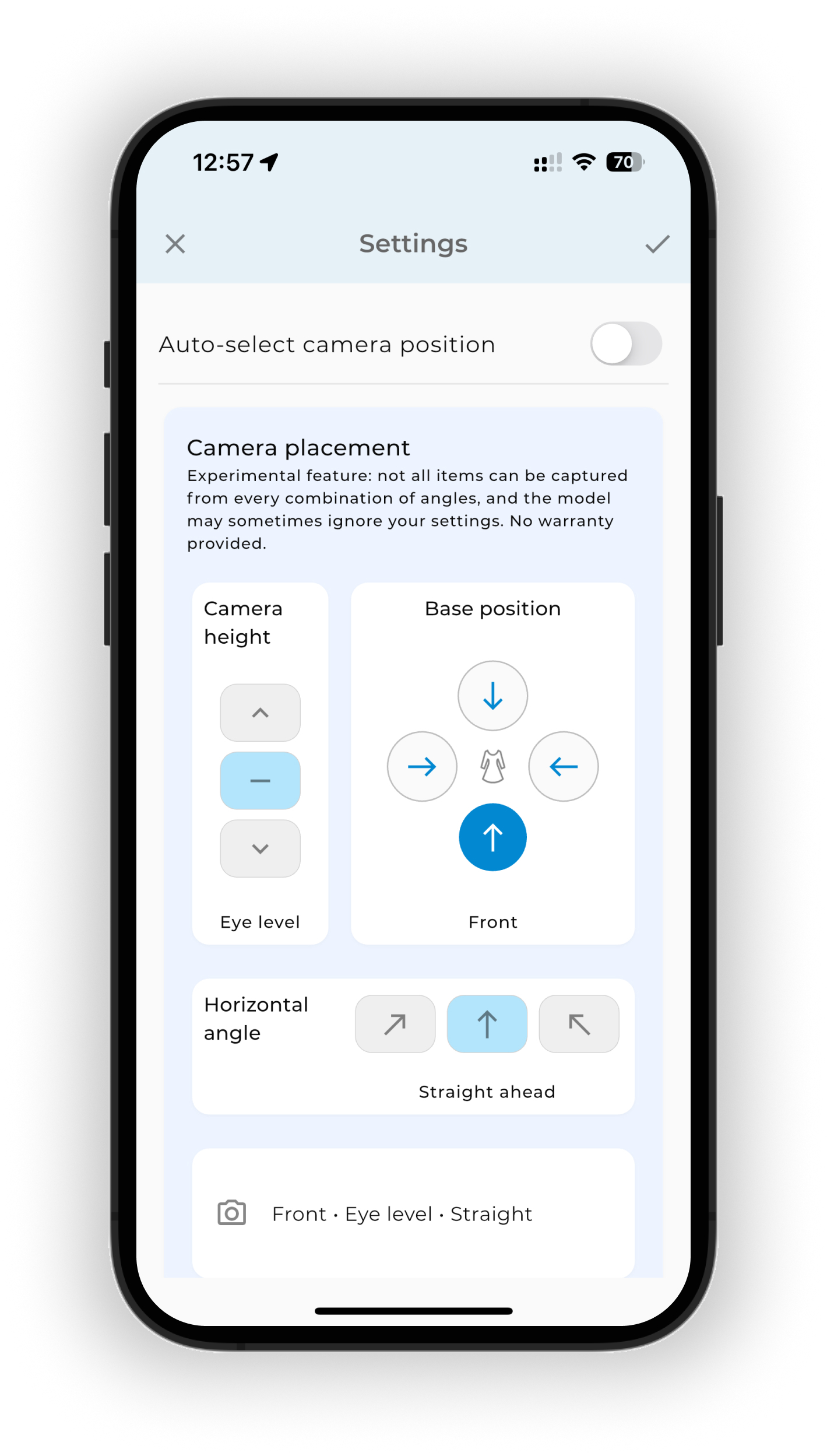 If you turn off automatic camera positioning, you can set the placement manually. This option works for categories such as shoes, headwear, bags, and accessories.