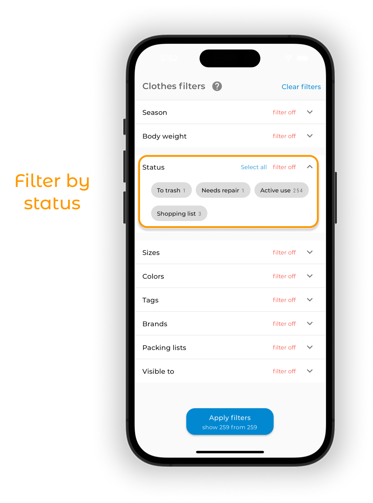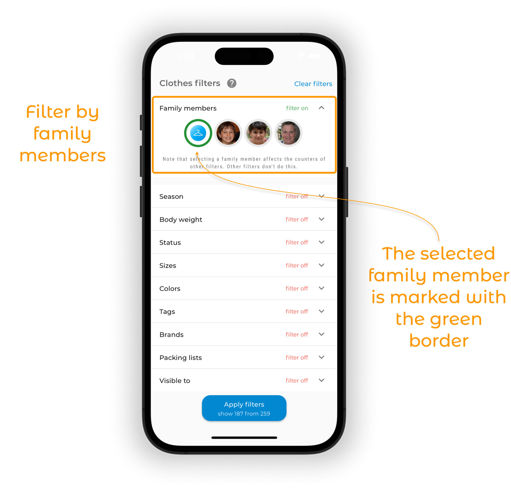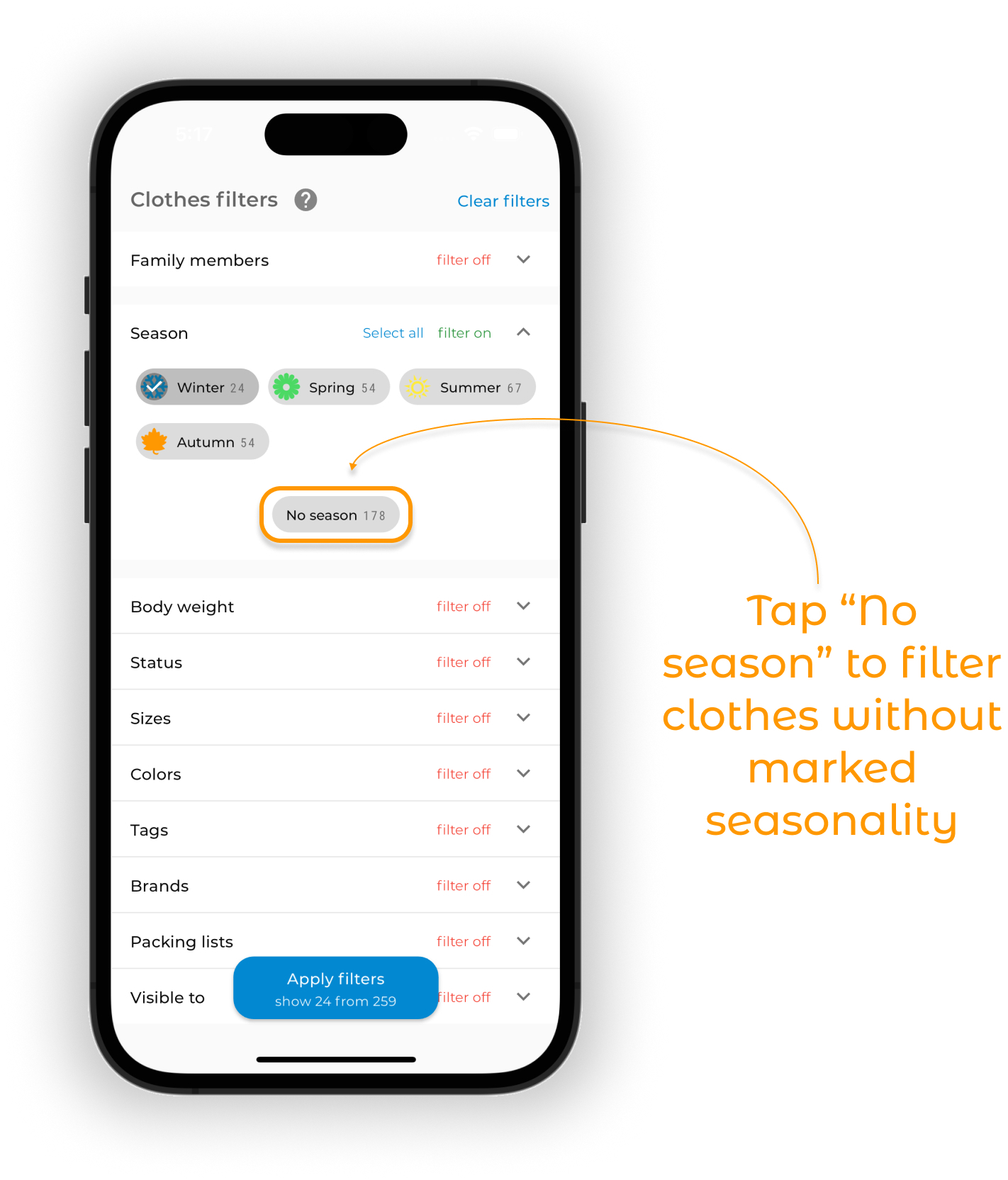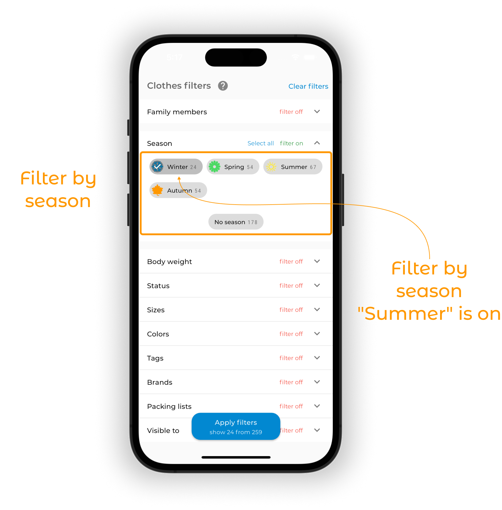 Narrow your wardrobe to specific items by filtering by season, color, brand, tags, size, weight, status, and family members.