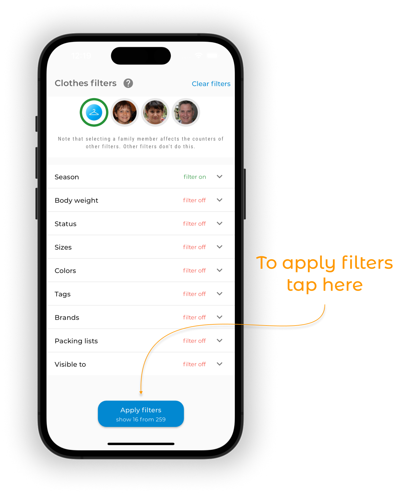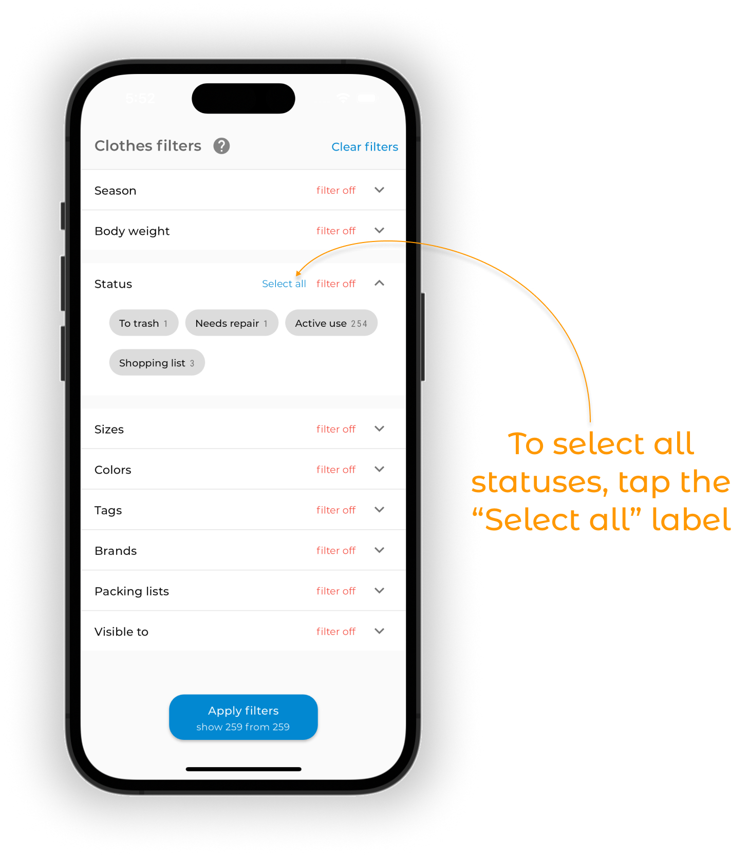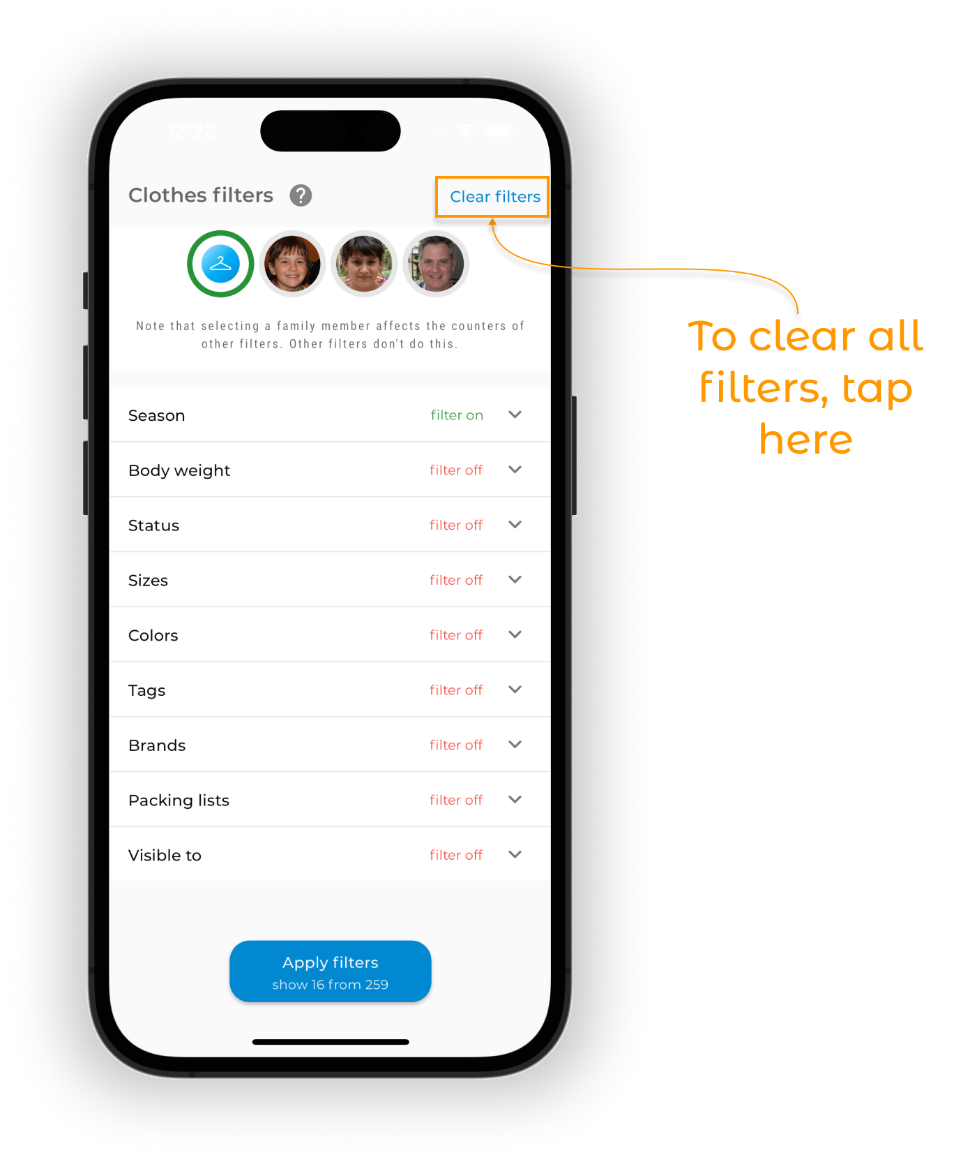 Narrow your wardrobe to specific items by filtering by season, color, brand, tags, size, weight, status, and family members.