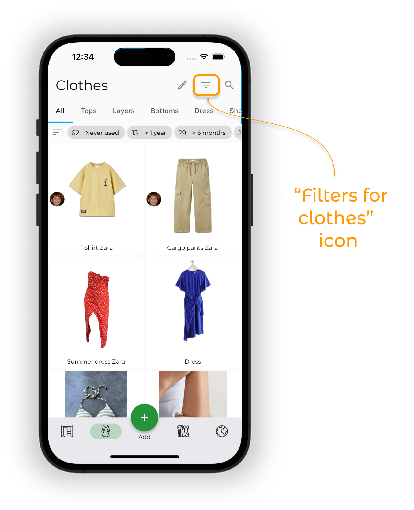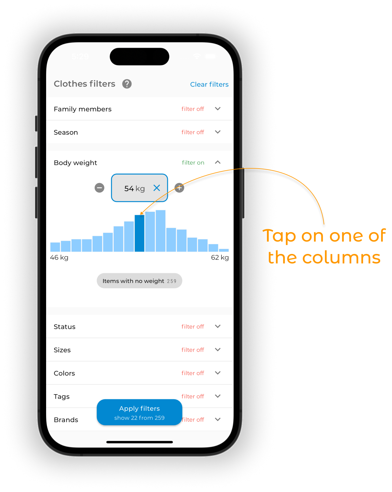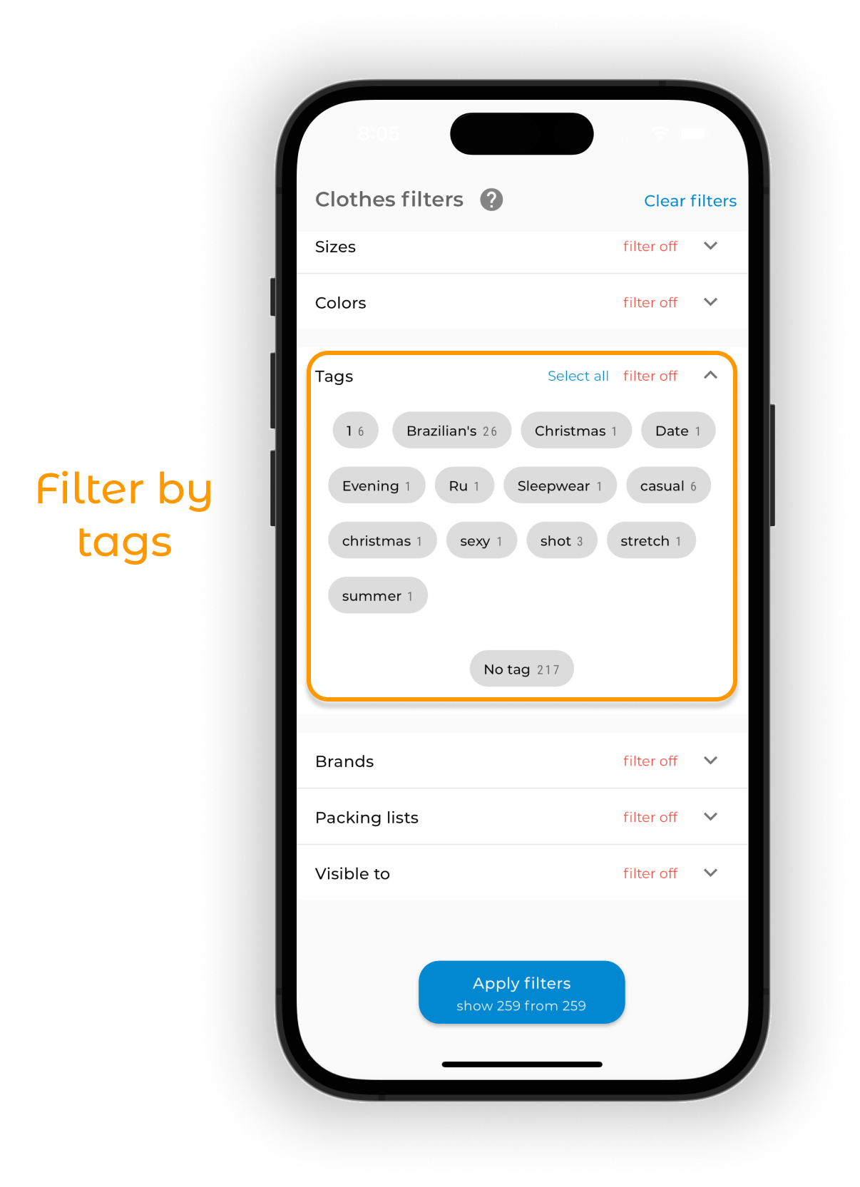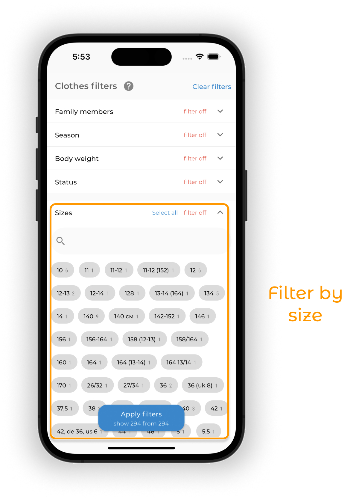 Narrow your wardrobe to specific items by filtering by season, color, brand, tags, size, weight, status, and family members.