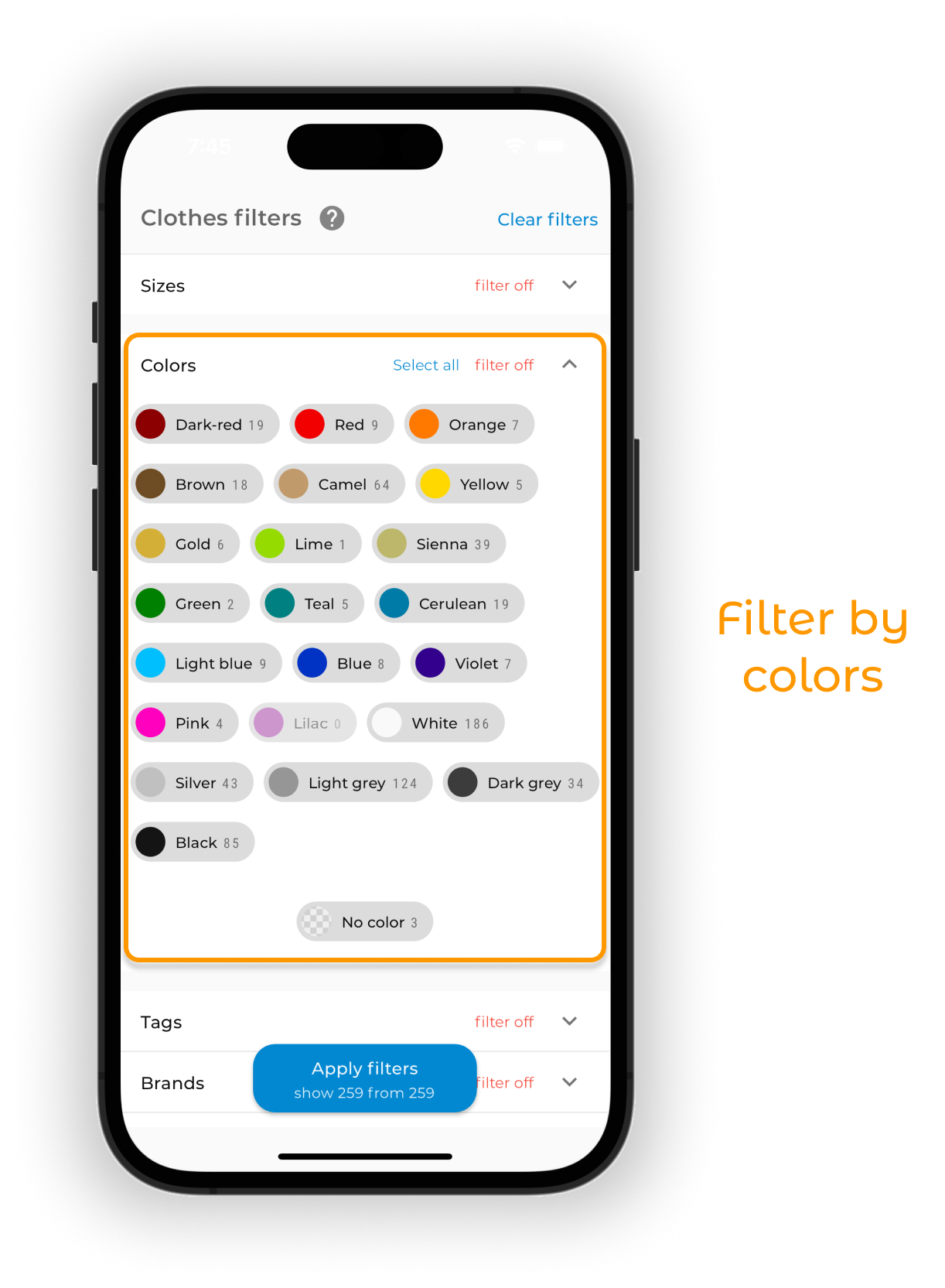 To filter items by size, tap the "expand" icon to see all sizes. Then, select a size or more sizes by tapping it.