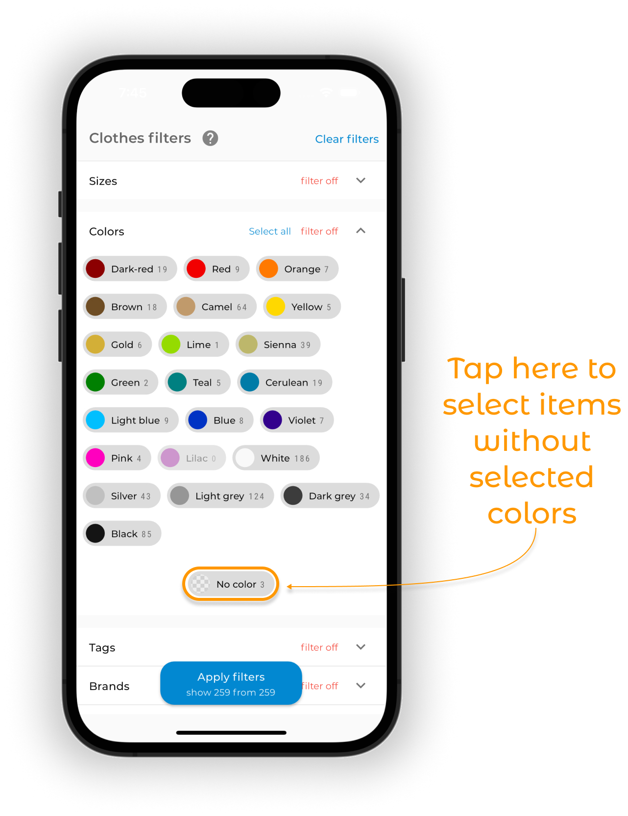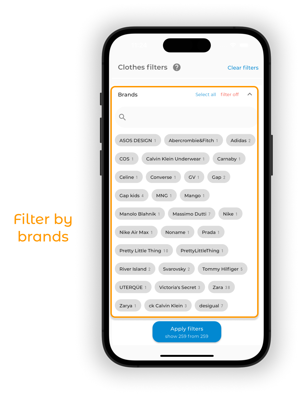 To filter clothes by brand, tap the "expand" icon and select a brand.