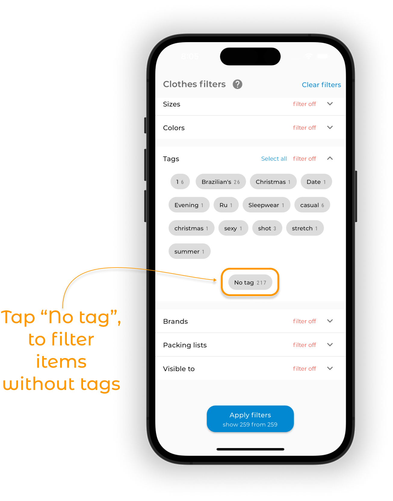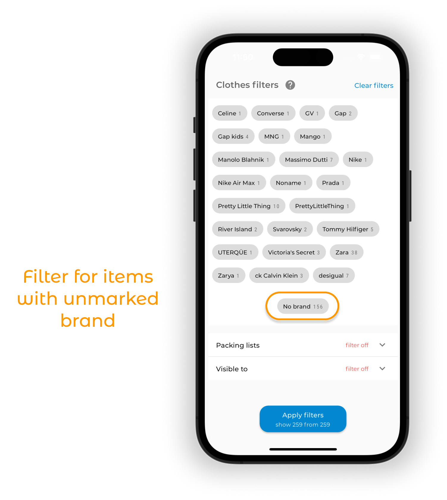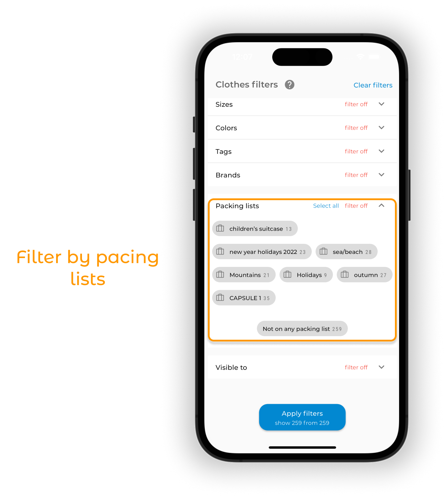 If you have packing lists, you can filter items by them. To filter clothes, select one of packing lists or "Not on any packing list".