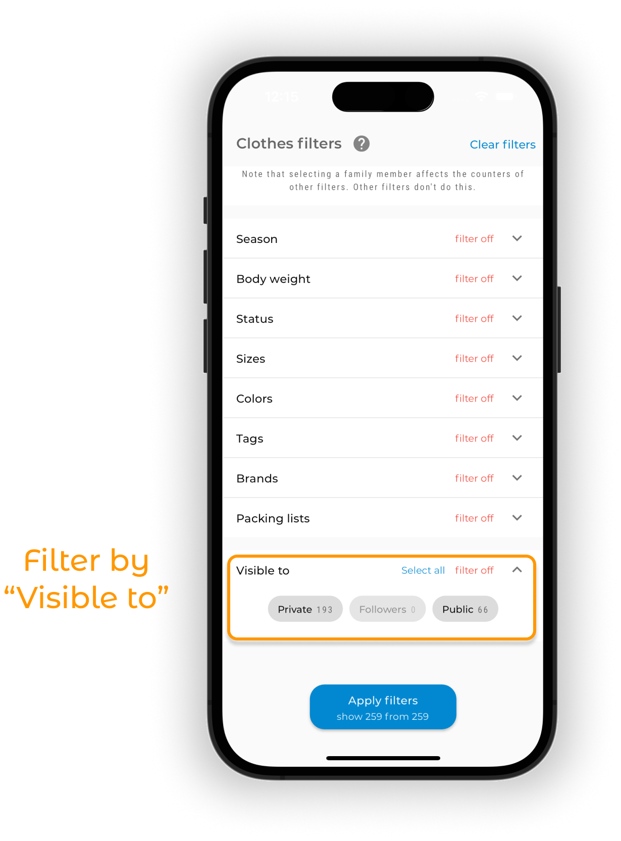 Family members Season Body weight Status Size Colors Tags Brands Packing lists Visibility