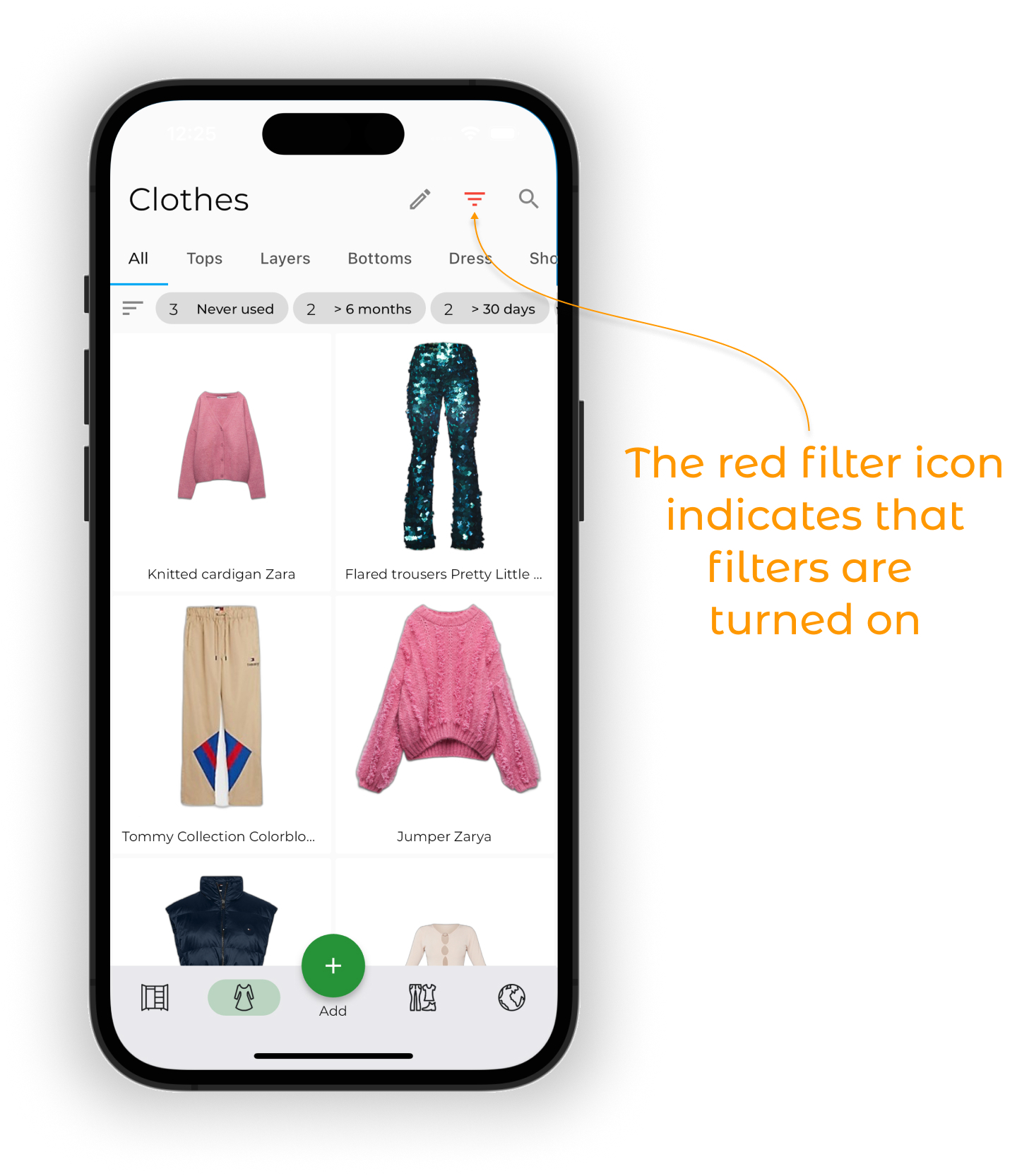 When any filters are applied, the filter icon turns red on the Clothes screen.
