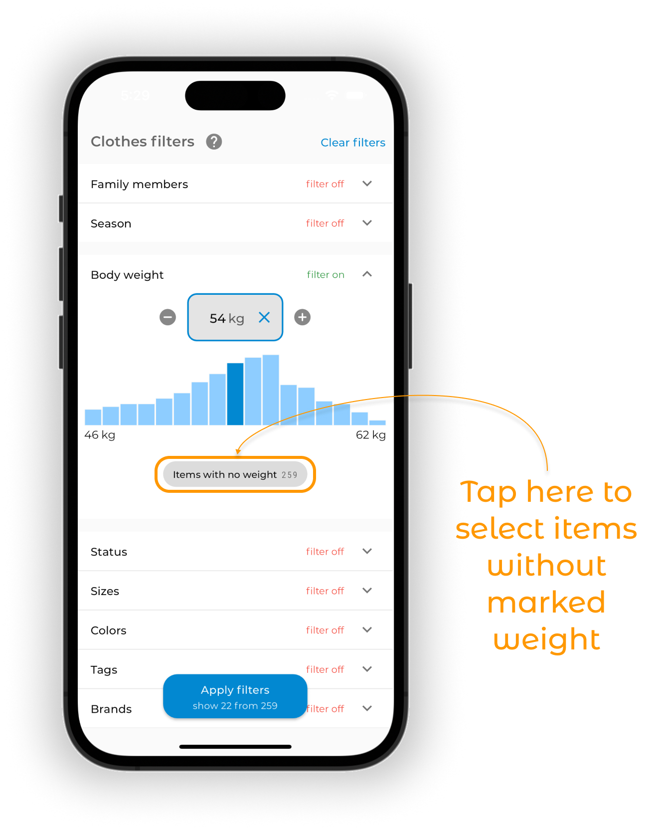 Please note that the body weight filter may be disabled in your app. To activate the filter, go to the application settings.