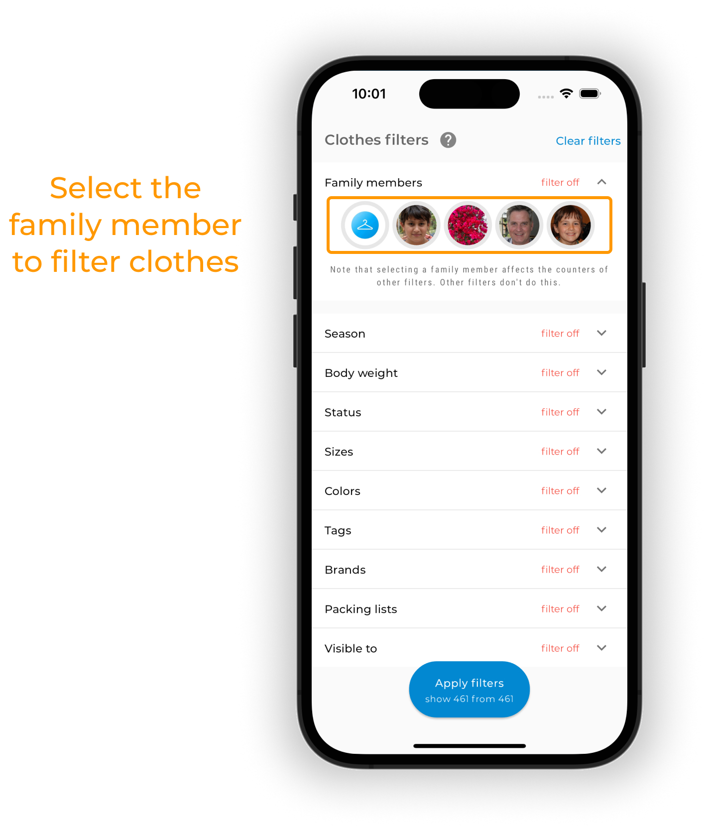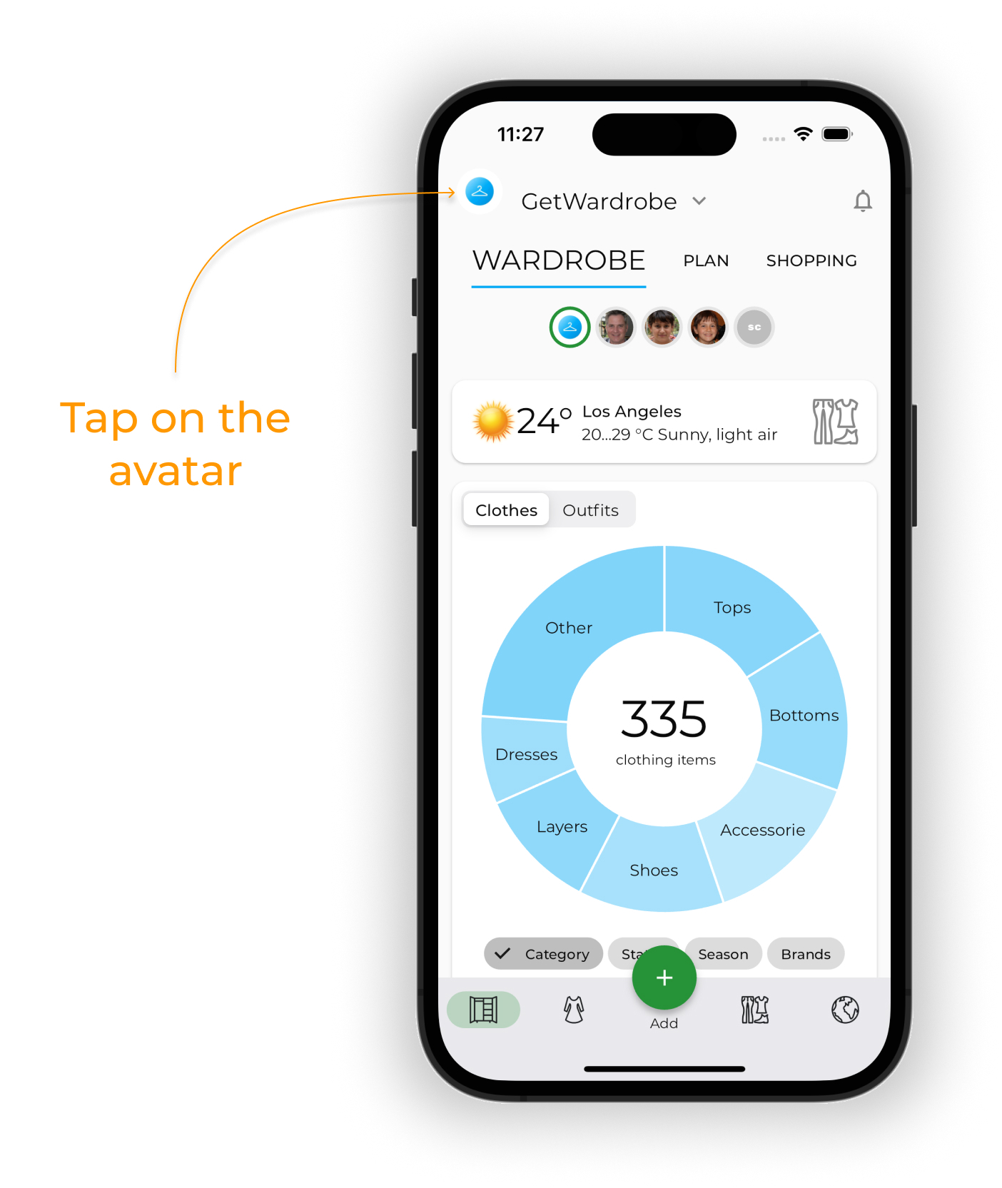 To view a family member's wardrobe statistics, tap on its avatar on the main screen.