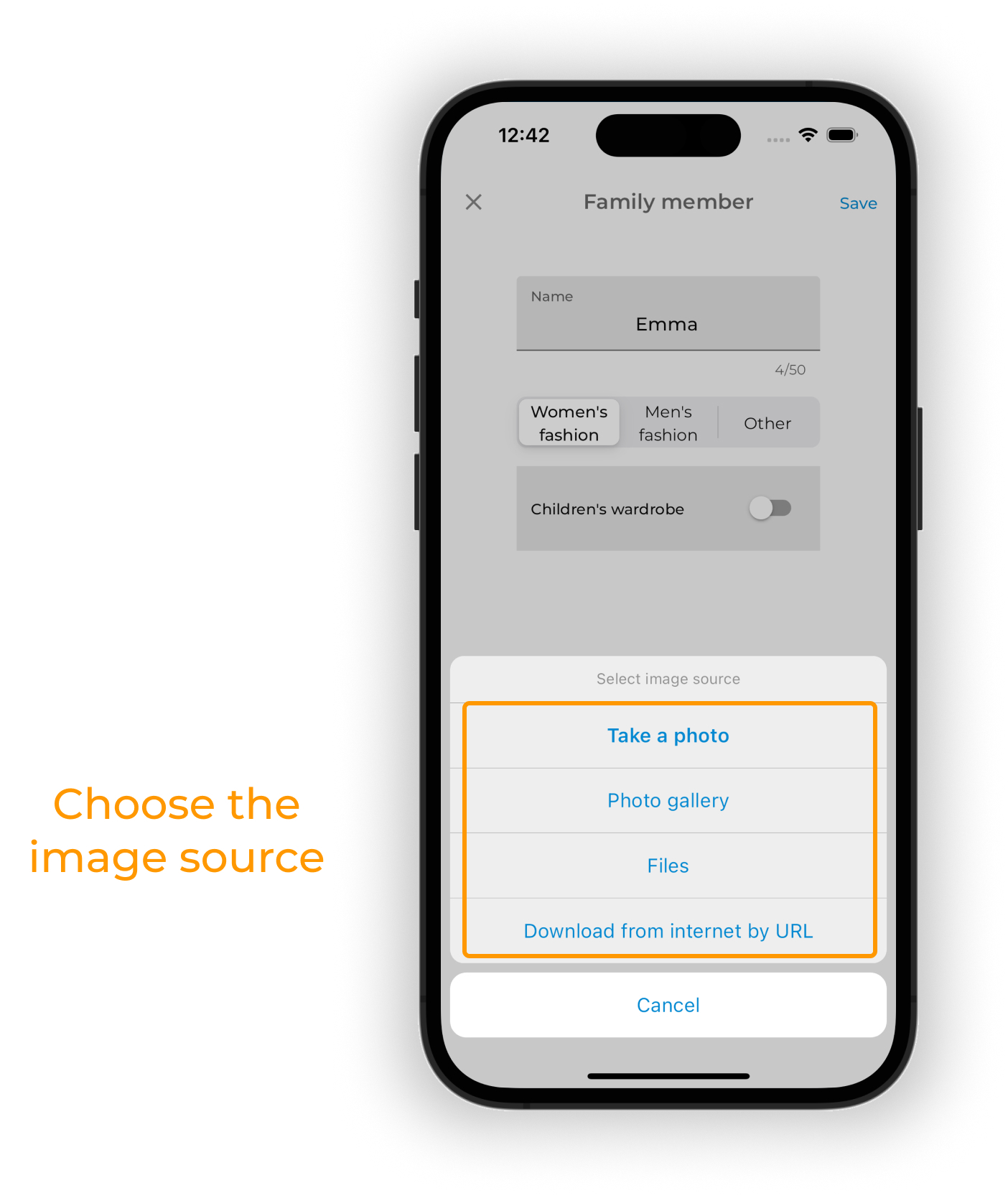 Choose the image source for your avatar: Upload a photo from your gallery, select a file from your device, take a photo with the Getwardrobe app's camera, or download an image from the internet using a link URL.