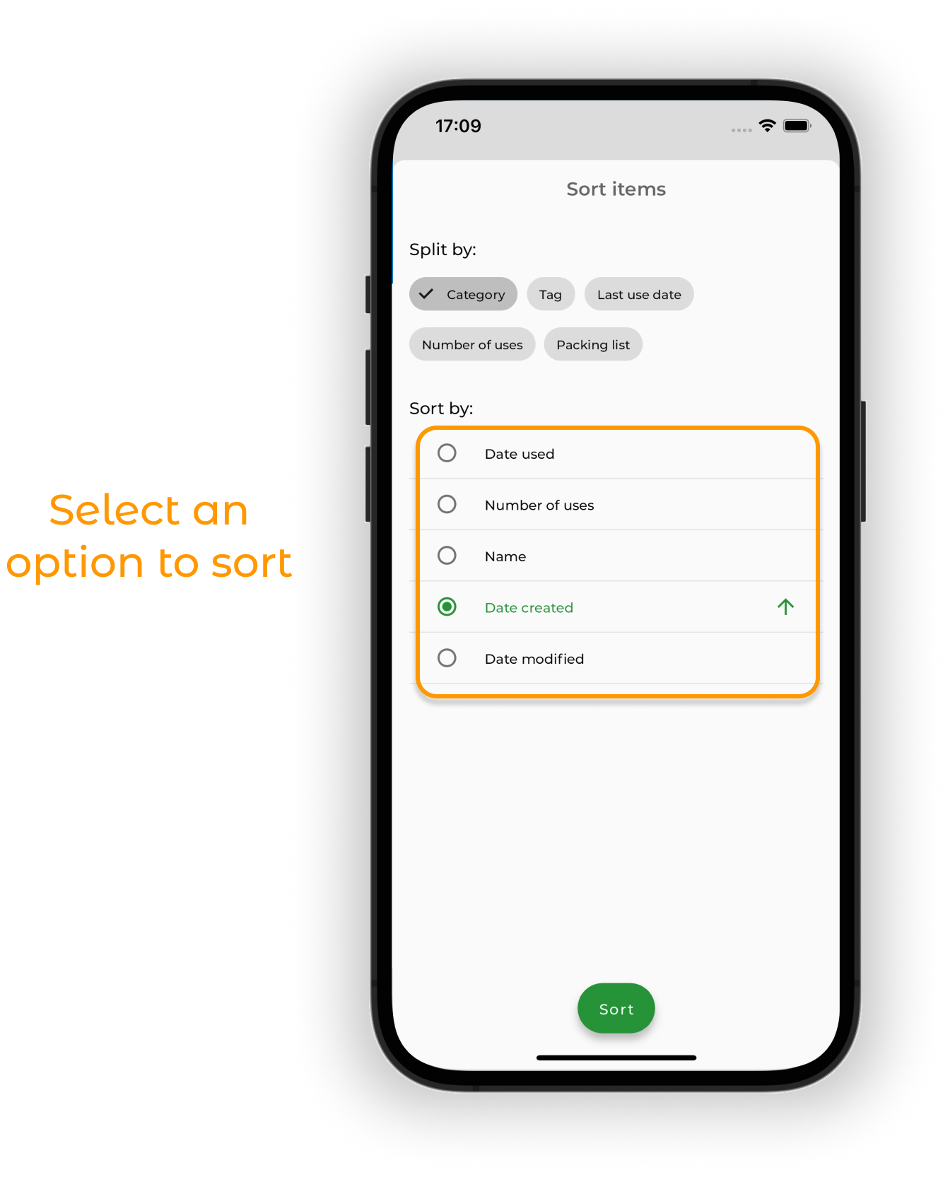 Choose how you want to sort outfits by options such as "Date used," "Number of uses," "Name," "Date created," and "Date modified." Then tap the "Sort" button.