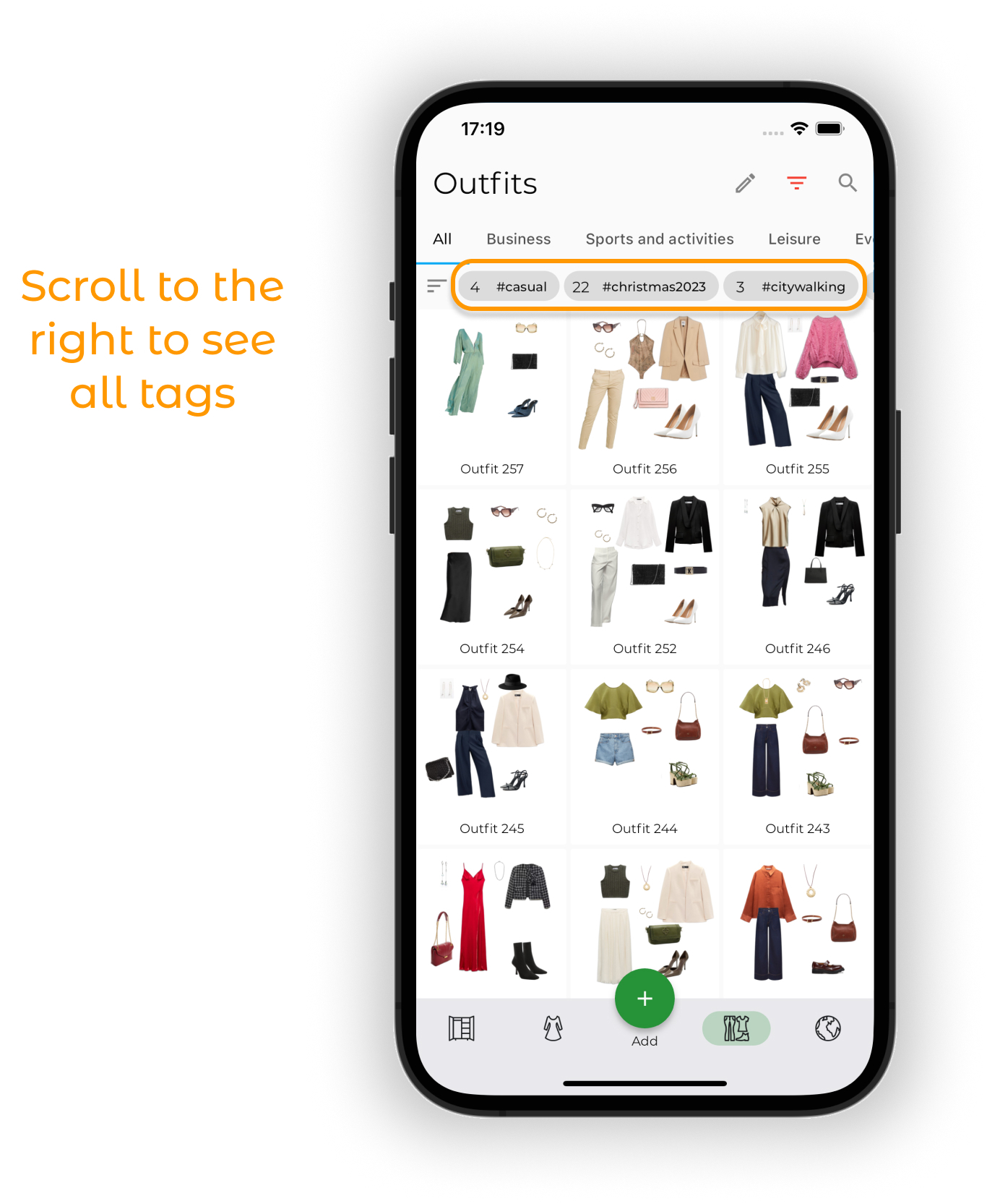 Outfits will be organized by tags. Tap on a tag to view your outfits with this tag.