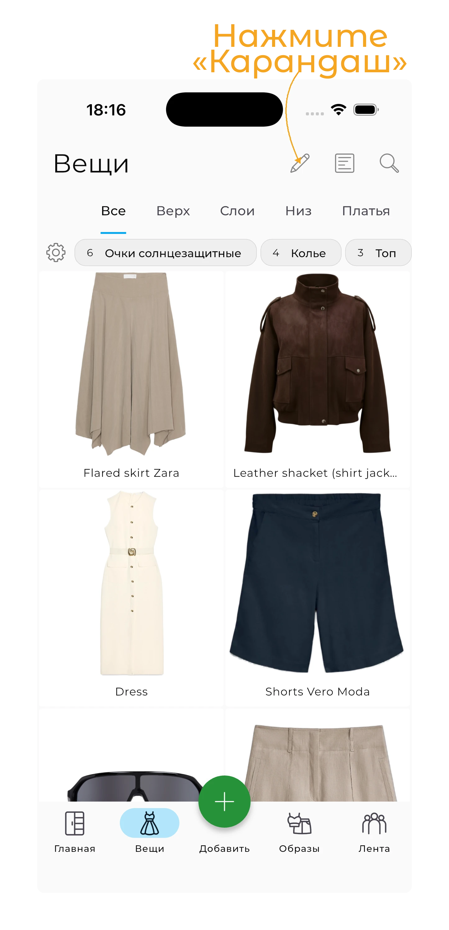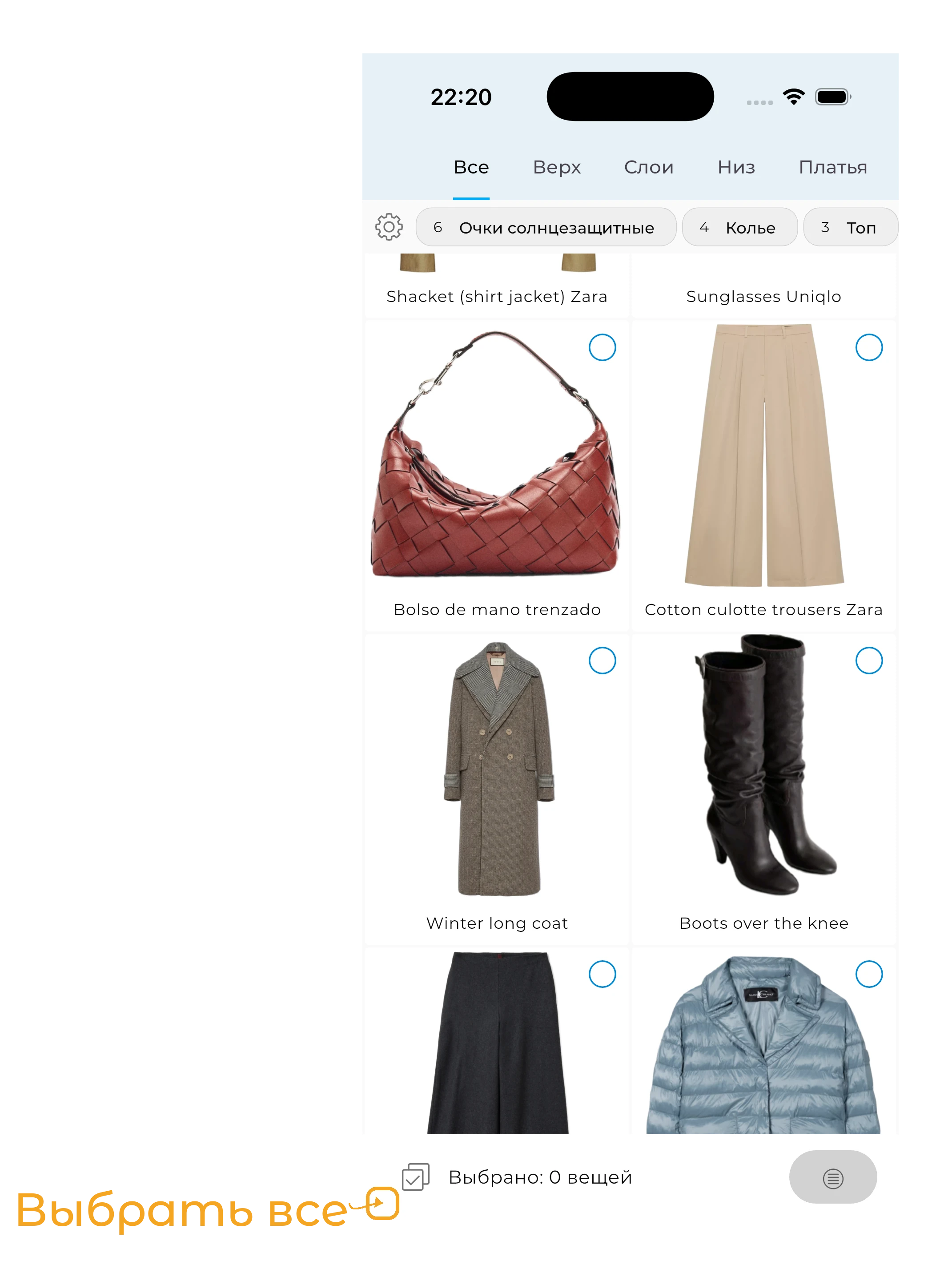 Затем выберите одежду, которую вы хотите отредактировать, нажав на неё. Если вы хотите отредактировать все вещи, нажмите на квадратный значок с точками в нижнем левом углу экрана.