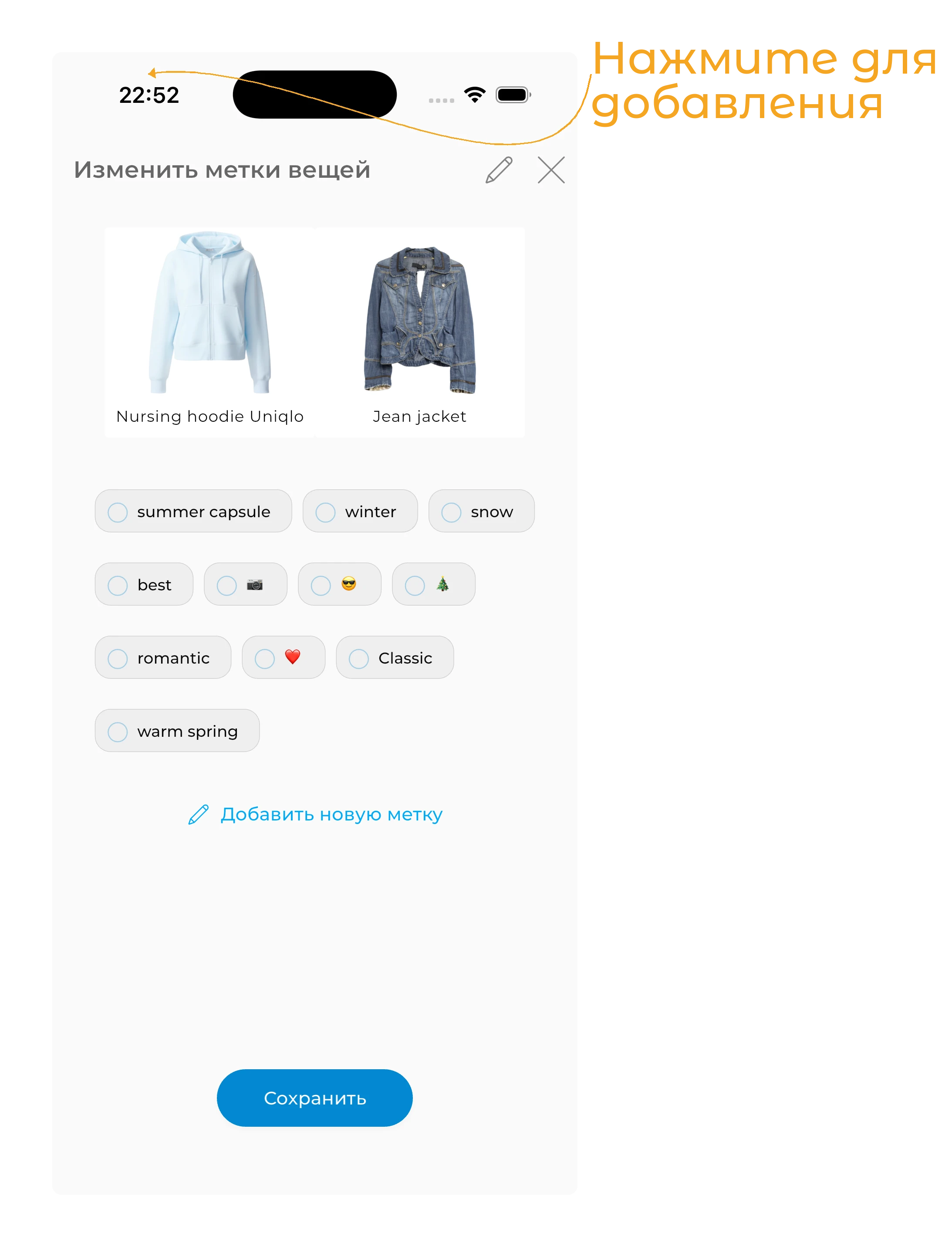 Вы можете добавлять или удалять теги для этих вещей. Чтобы удалить тег, сначала нажмите на него, чтобы выбрать его. Затем нажмите на него снова, чтобы отменить выбор.