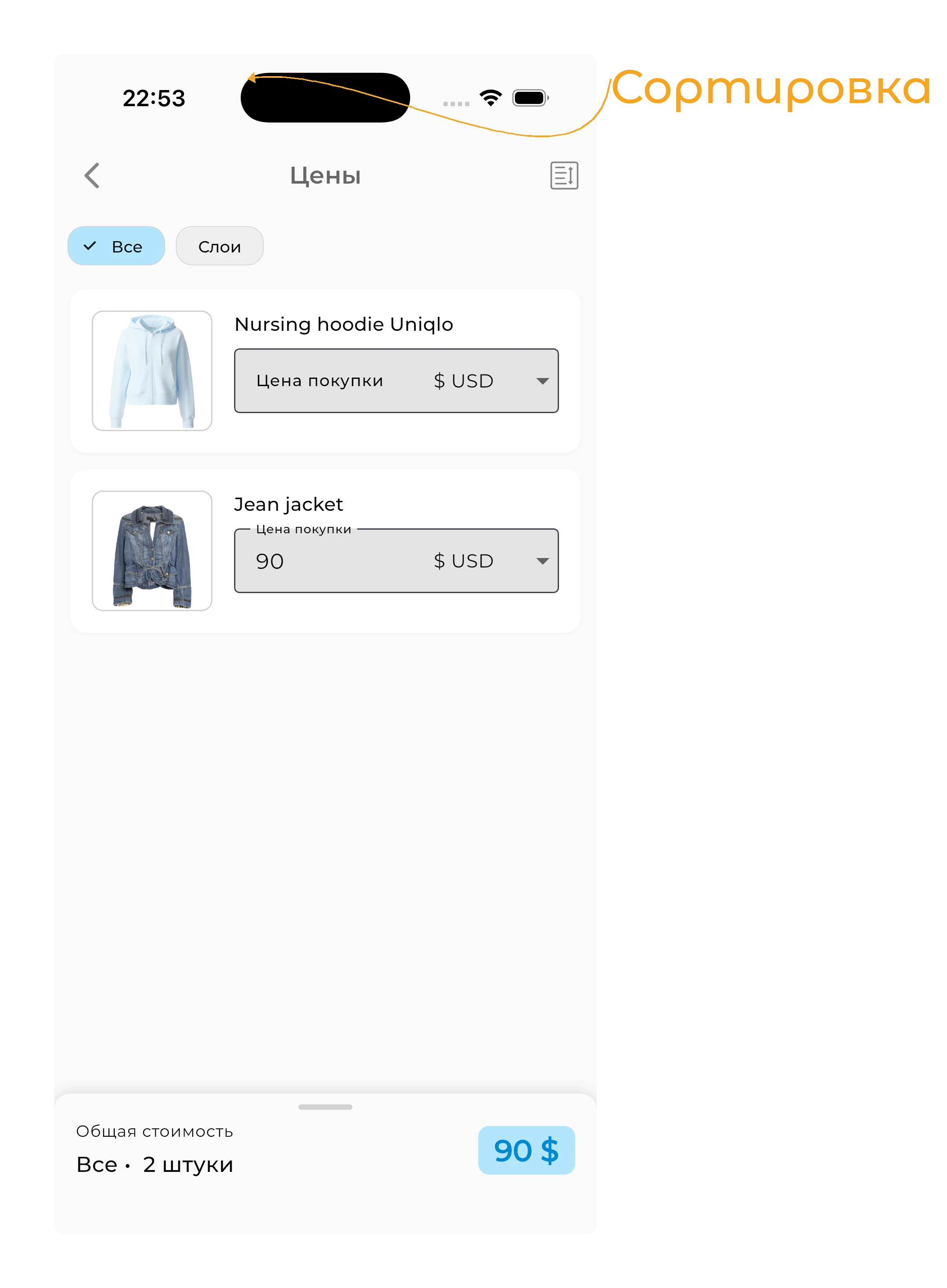 Здесь вы можете быстро добавить или изменить стоимость вещей. Чтобы отсортировать вещи в порядке возрастания или убывания по цене, нажмите на значок с тремя линиями в верхнем правом углу экрана.