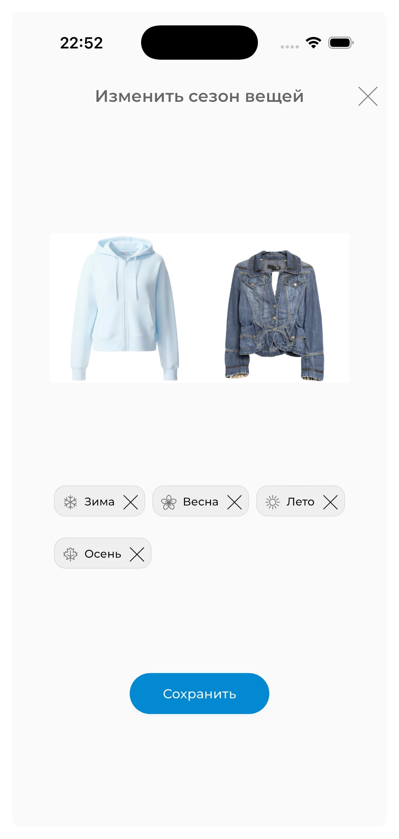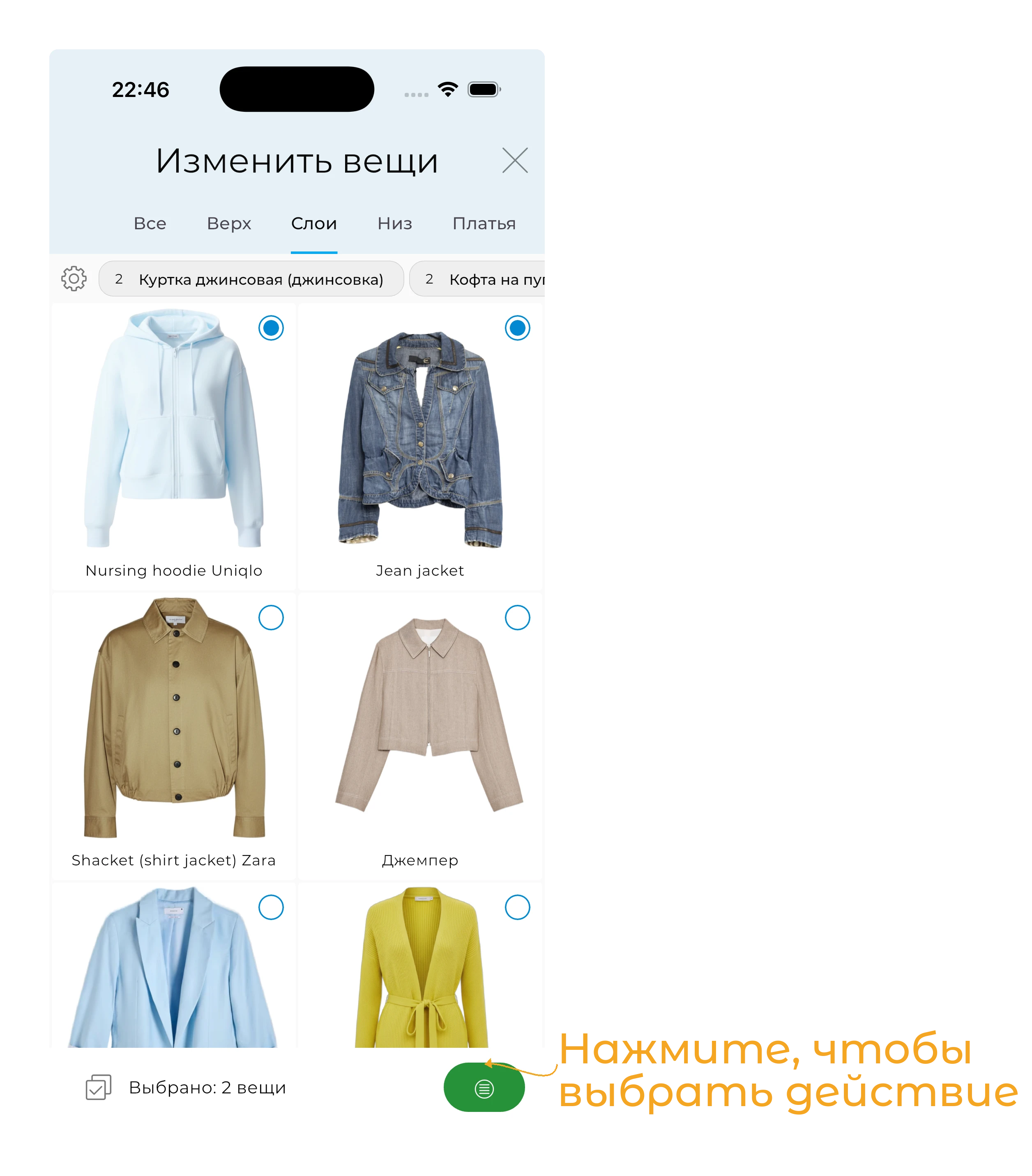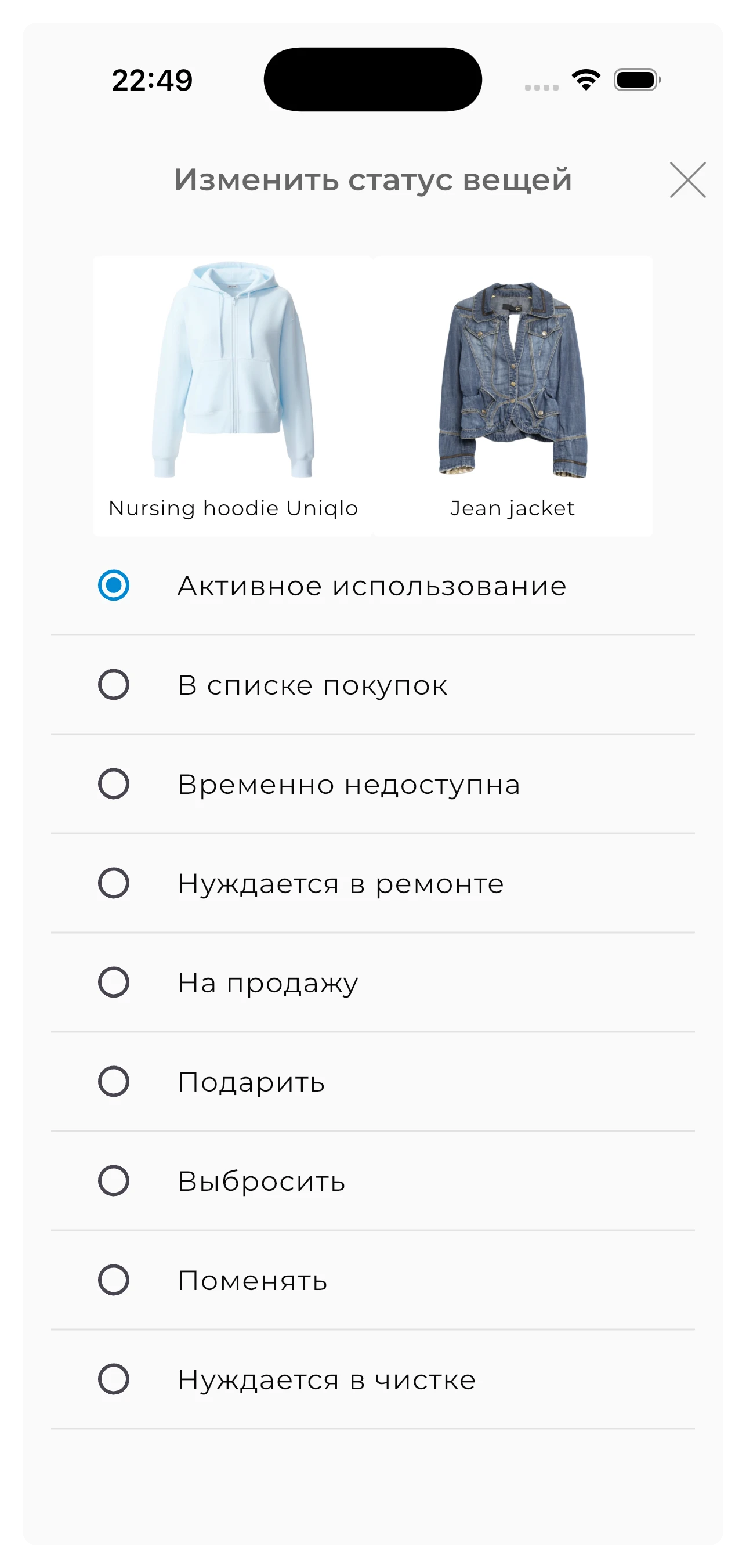 Выберите несколько вещей и одновременно удалите их, измените статус, сезоны, метки или назначение. Массовое редактирование значительно экономит время при организации большого гардероба.