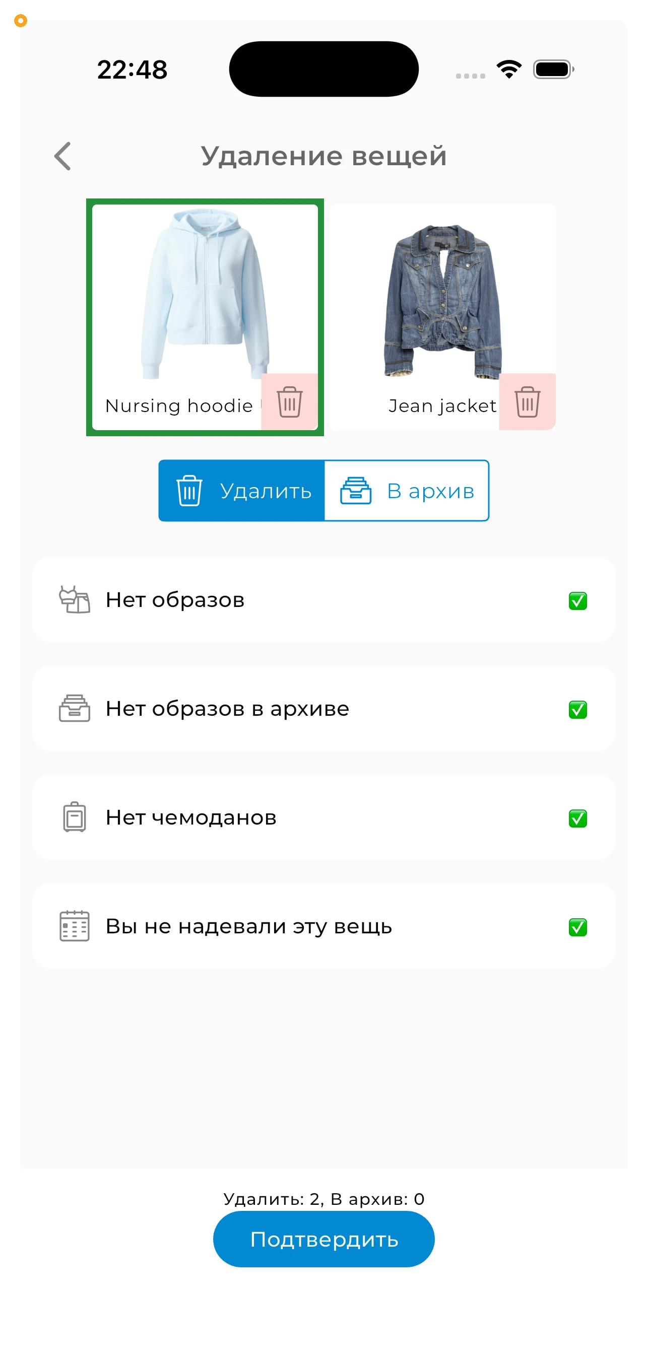 Чтобы удалить вещи, нажмите «Удалить». После этого приложение попросит у вас подтверждение.