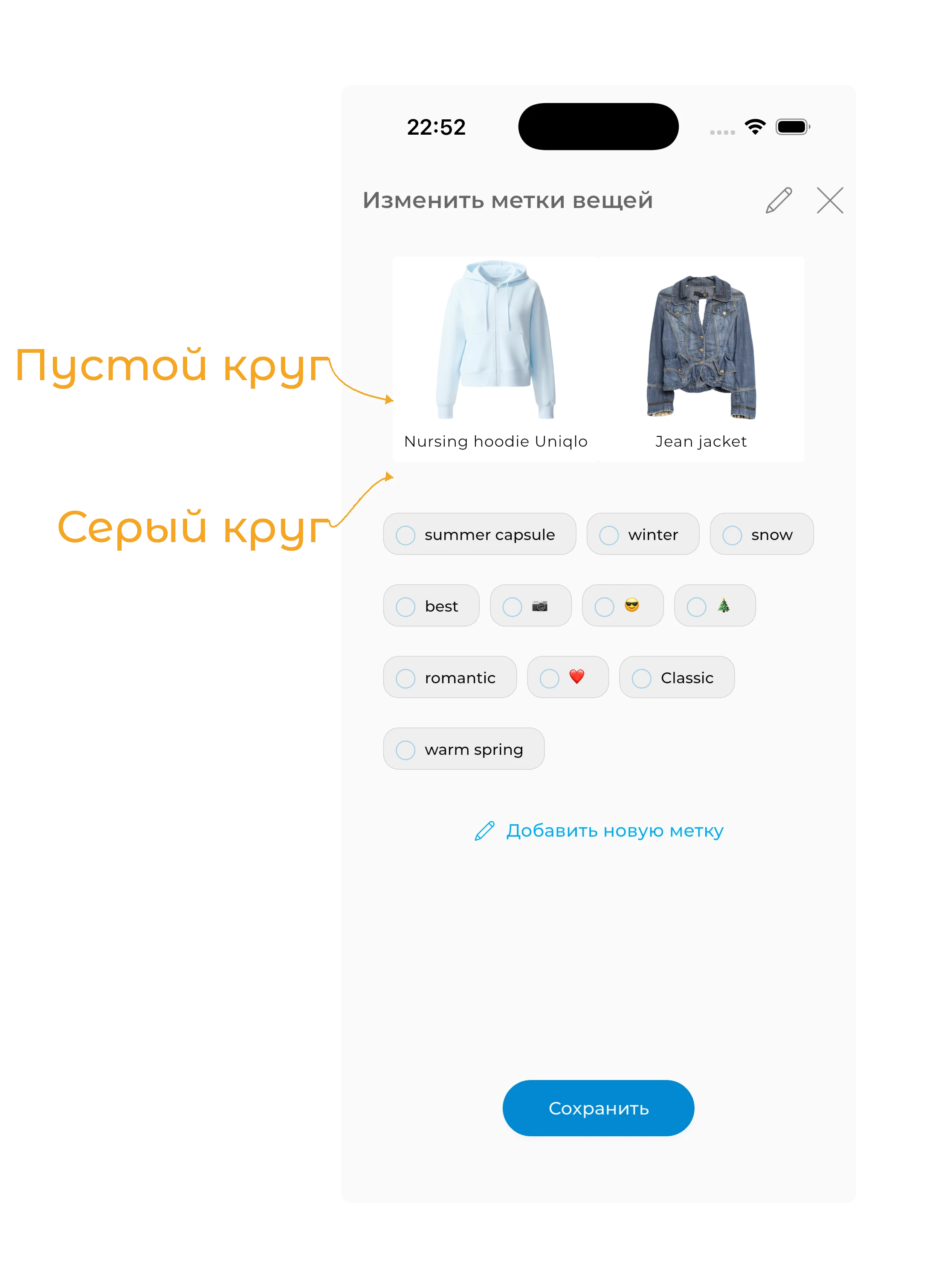 - Круг с галочкой — все выбранные вещи имеют этот тег