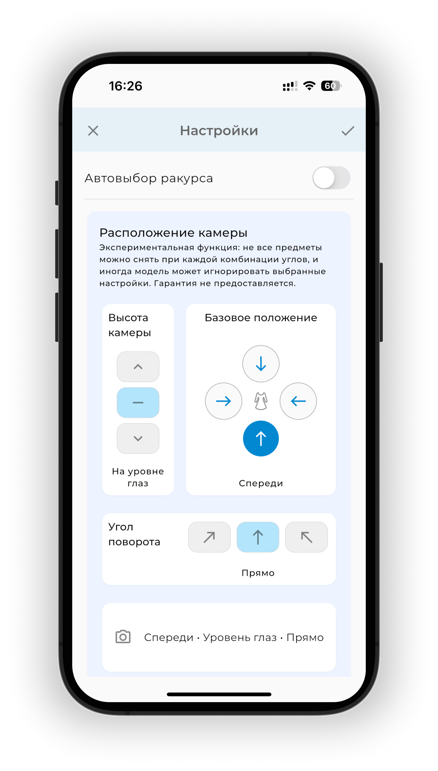 Если отключить автоматический выбор ракурса, вы сможете задать угол вручную. Изменение ракурса работает для категорий: обувь, головные уборы, сумки и аксессуары.