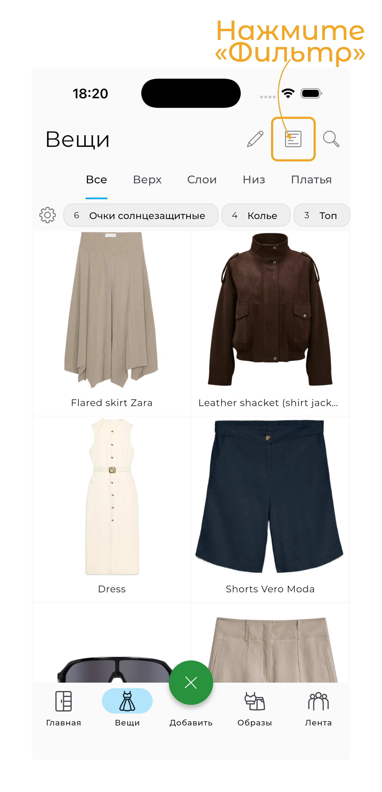 В разделе «Вещи» в правом верхнем углу нажмите на иконку «Фильтр».