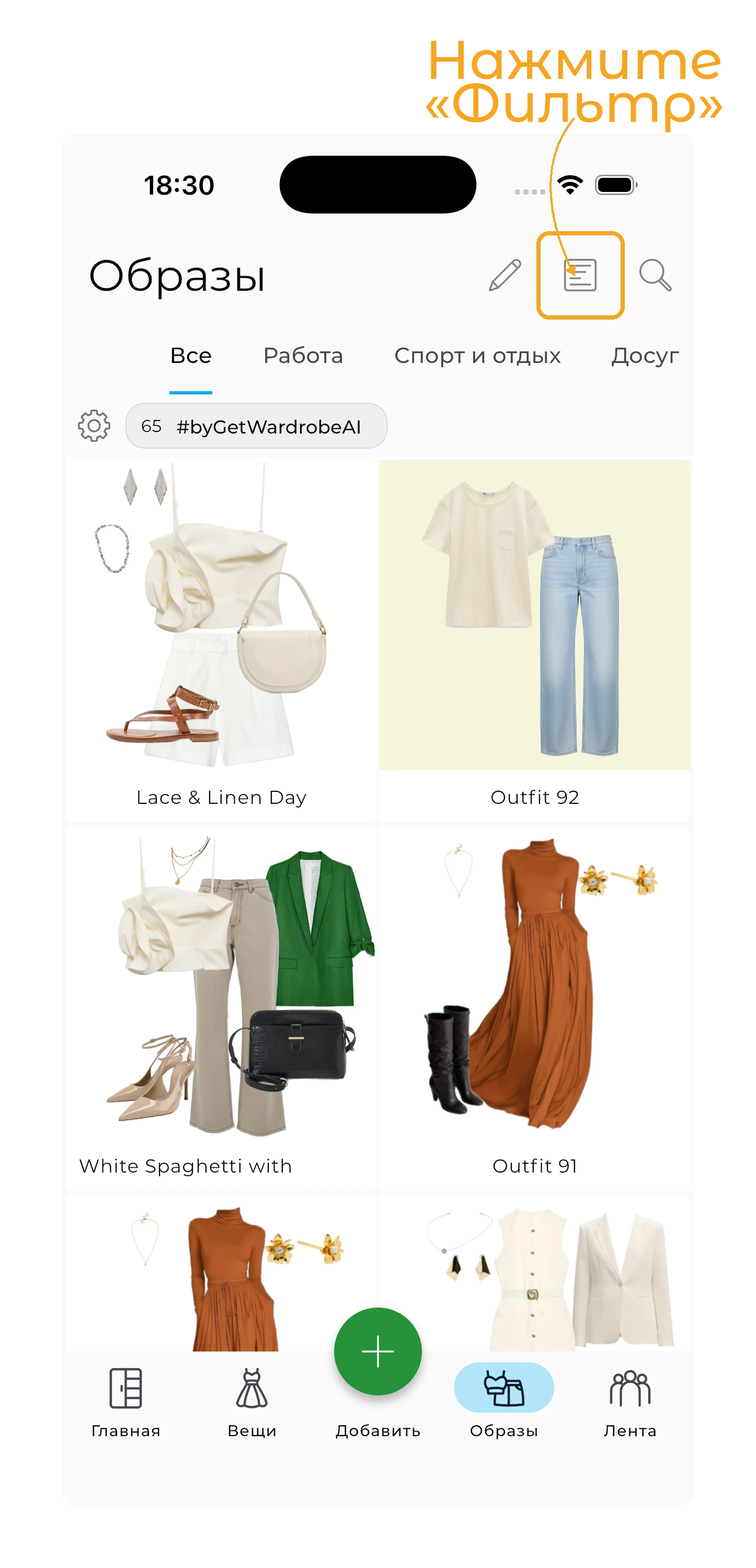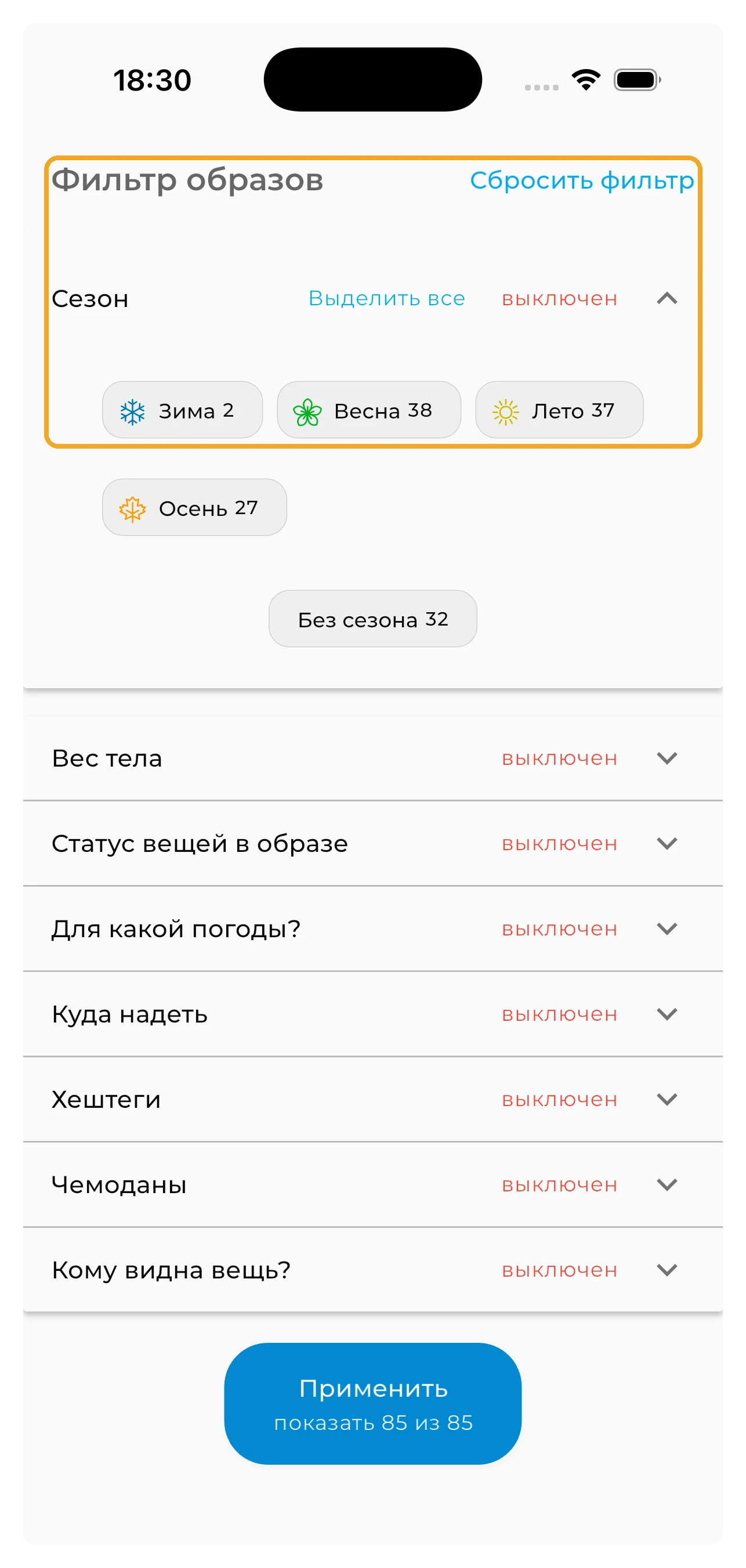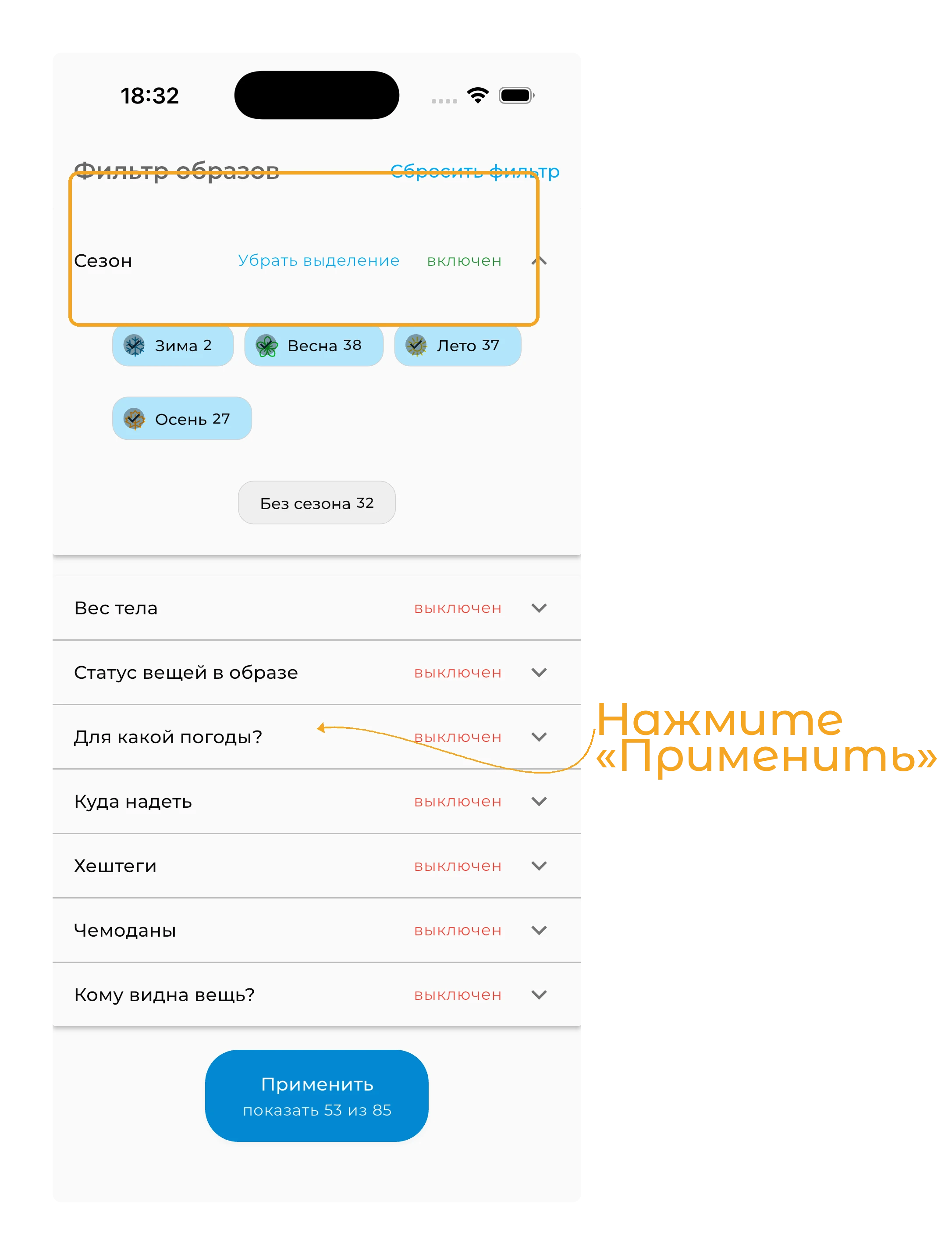 Откроется экран «Фильтр образов» с критериями: «Сезон», «Вес тела», «Статус вещей в образе», «Для какой погоды?», «Куда надеть», «Хештеги», «Чемоданы» и «Кому видна вещь?».