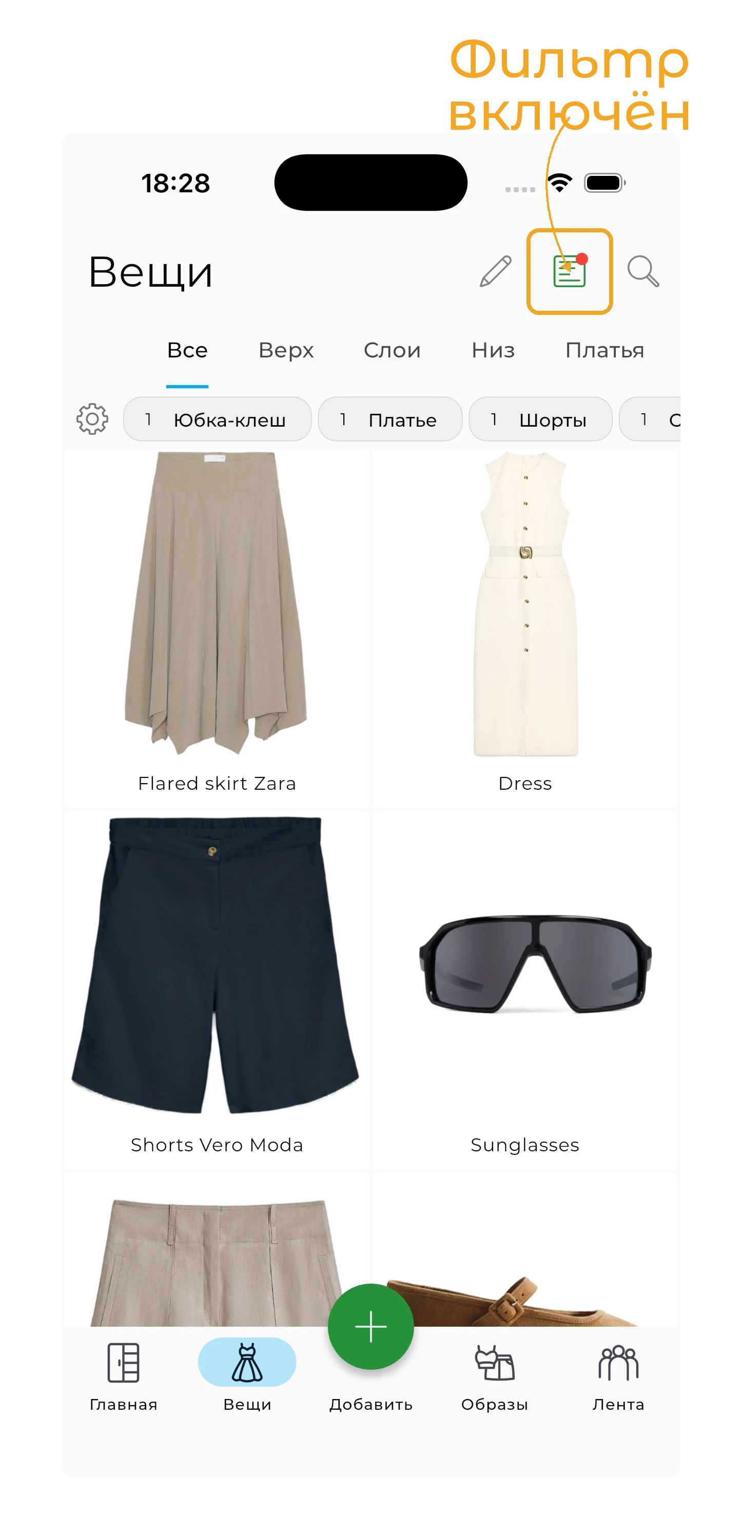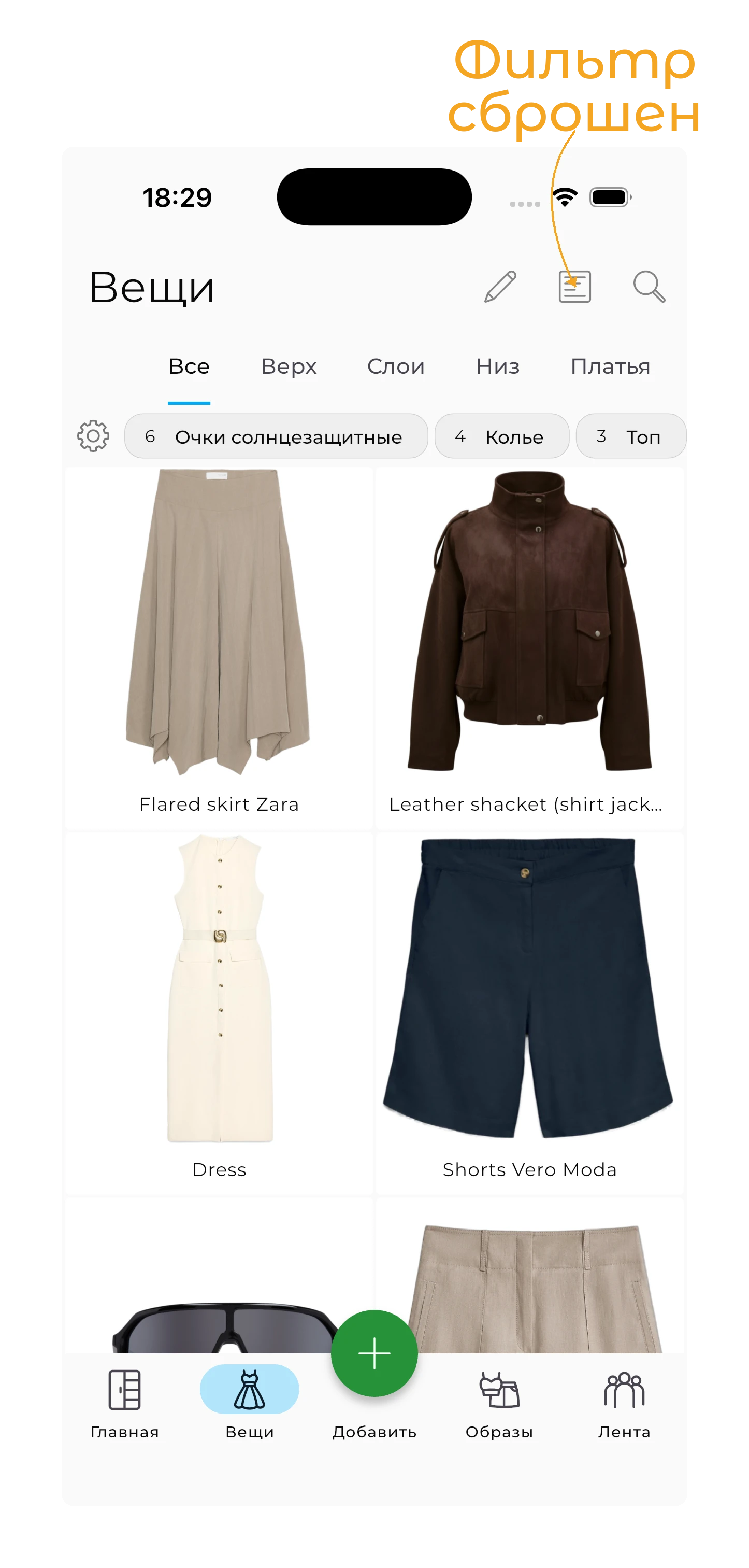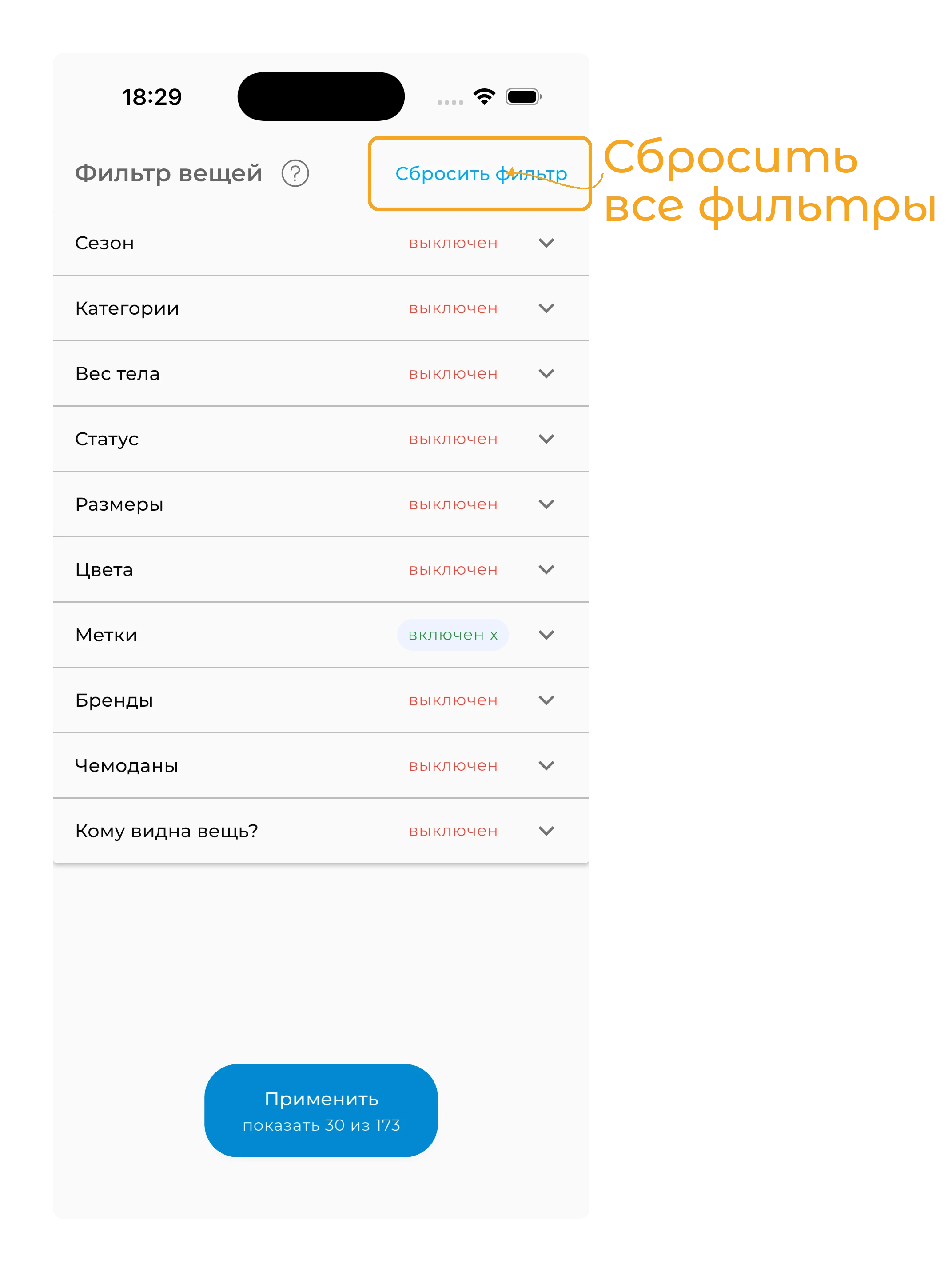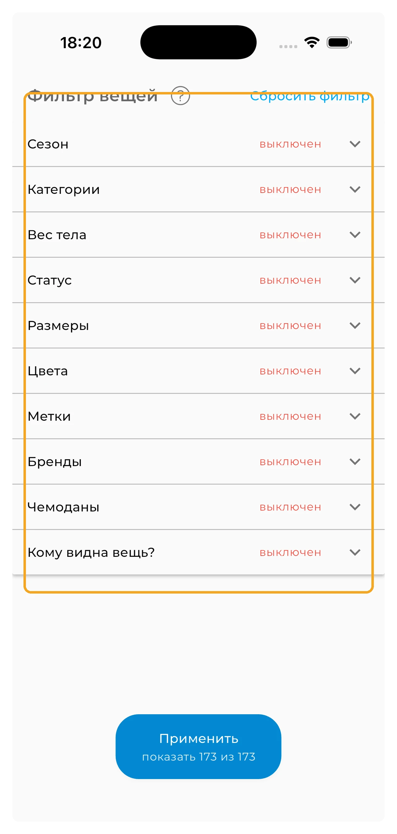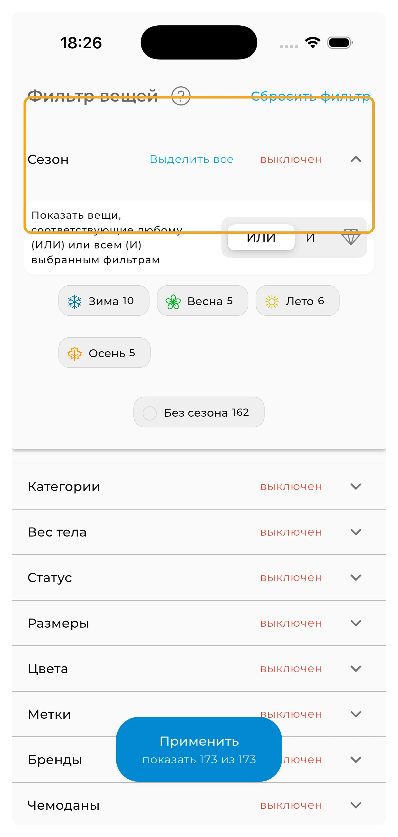 Фильтруйте вещи по сезону, цвету, бренду, меткам, размеру, весу, статусу и членам семьи. Сочетайте несколько фильтров, чтобы быстро найти нужные предметы в большом гардеробе.