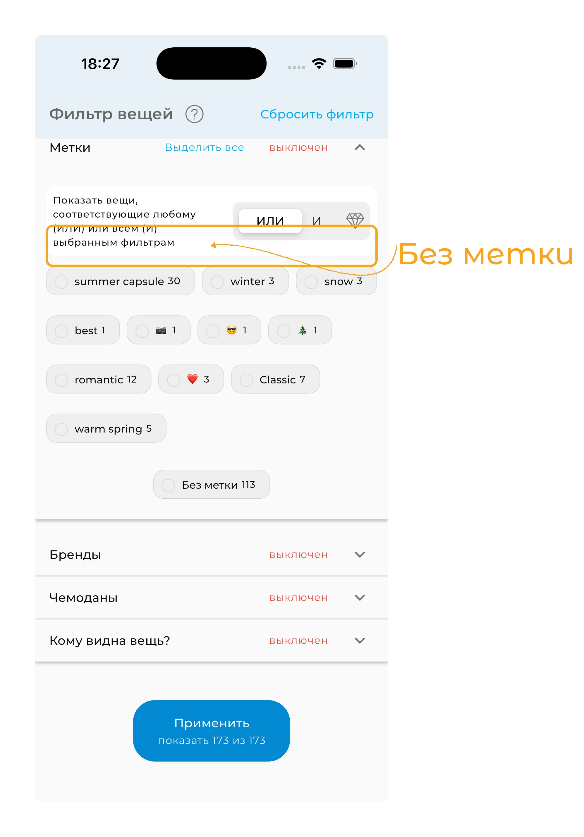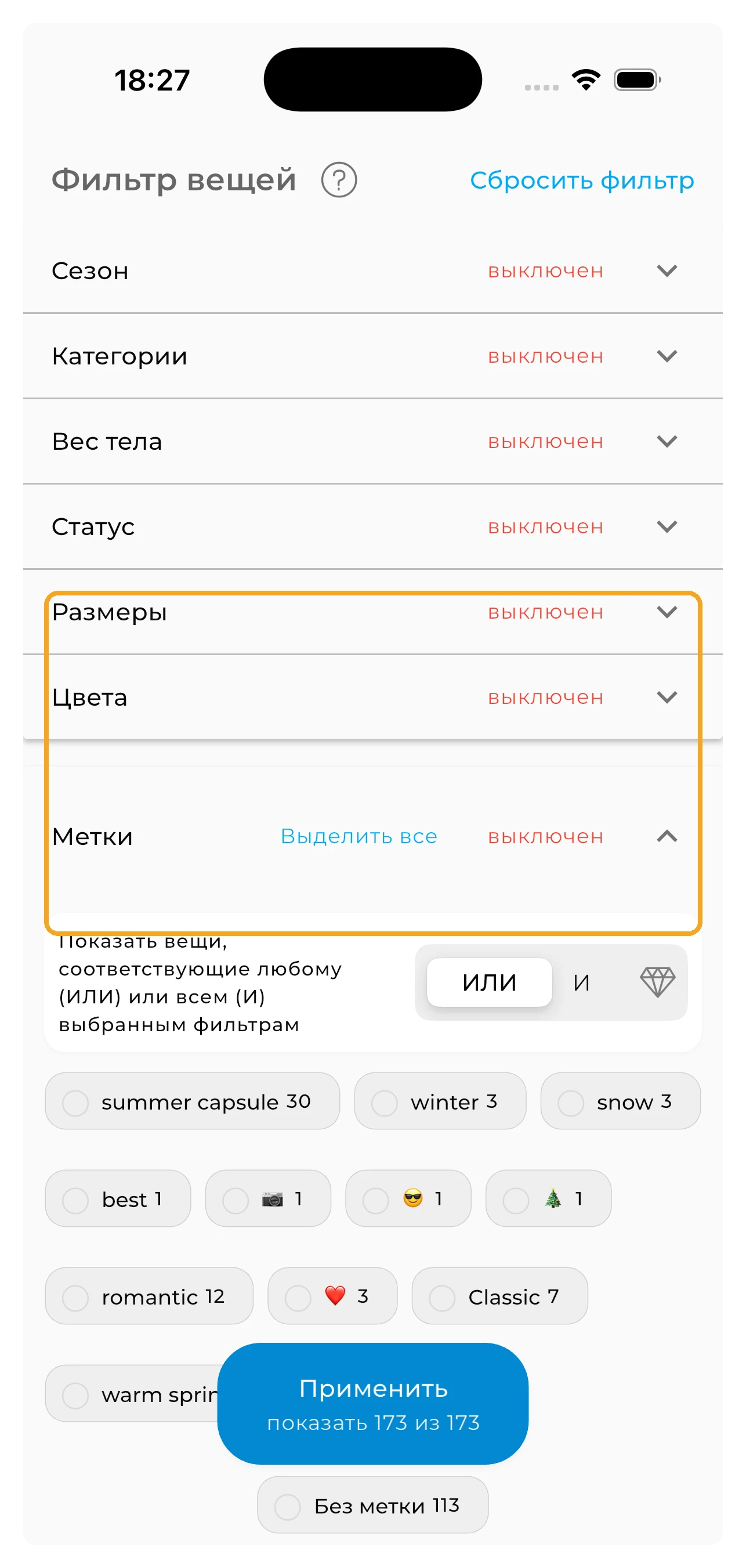 У каждого критерия в разделе фильтра имеется численный индикатор, который отражает количество вещей в гардеробе, которые подходят под фильтр. Выбирая фильтр, на нём появляется галочка. После выбора фильтров нажмите на кнопку «Применить» внизу экрана.
