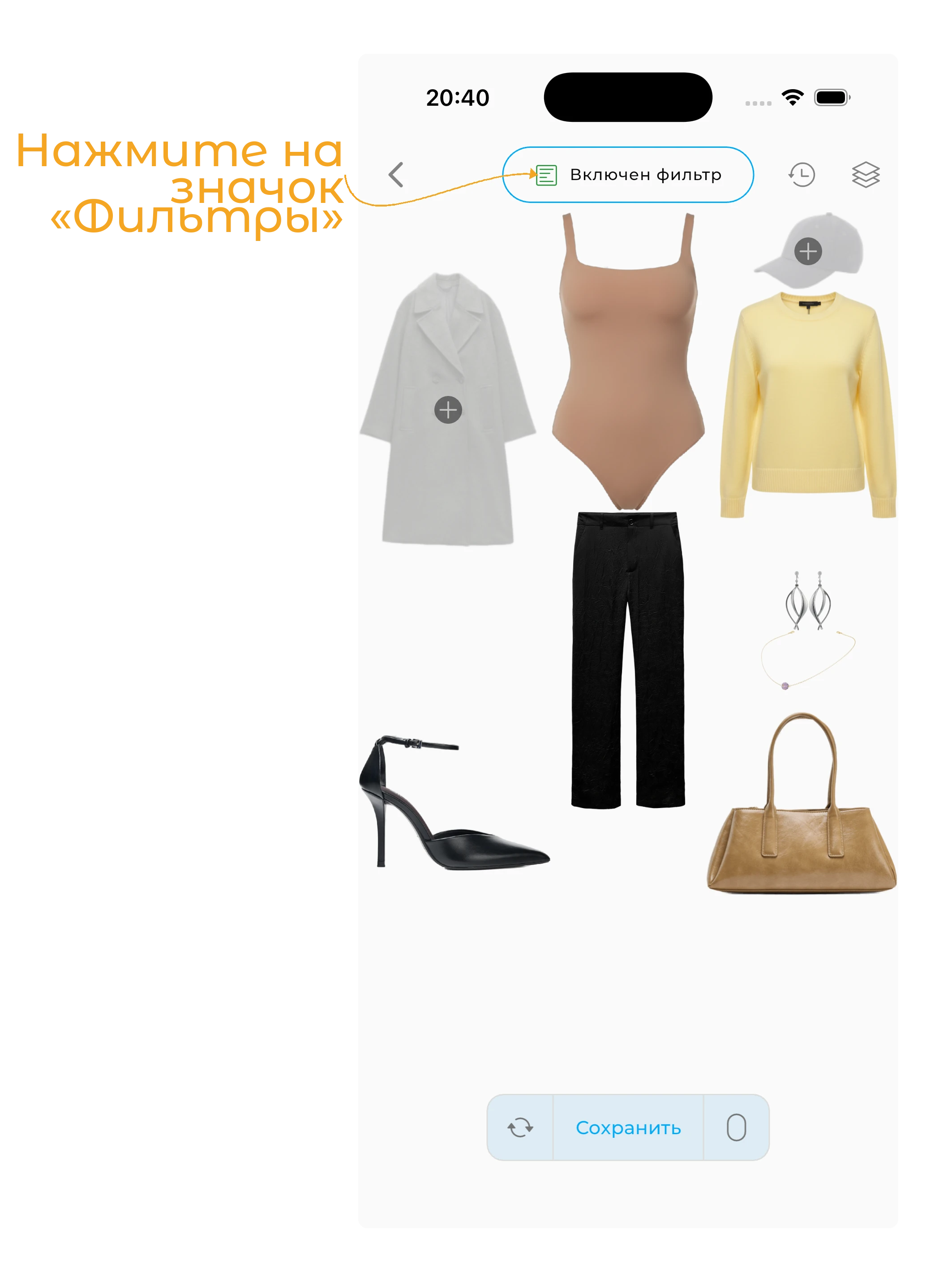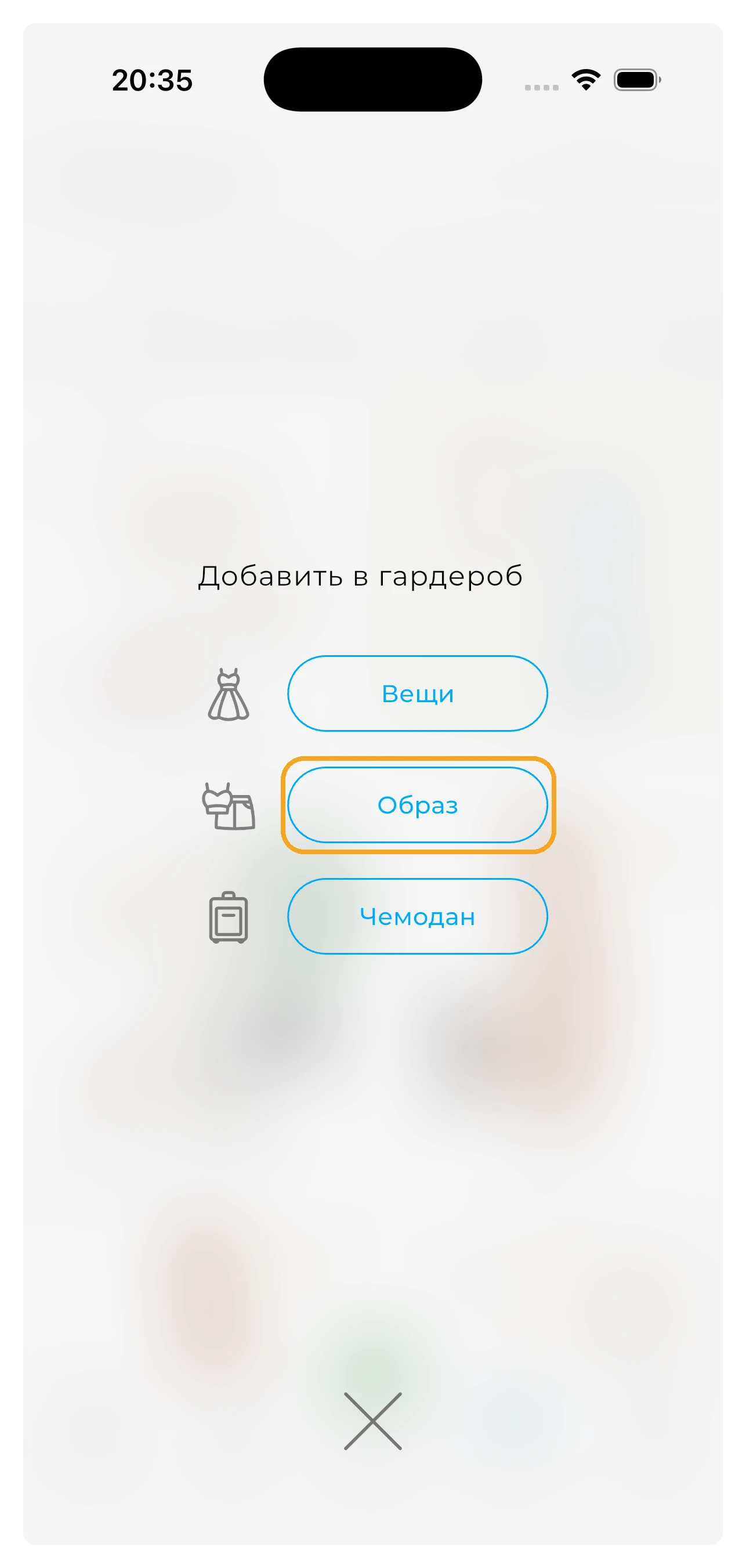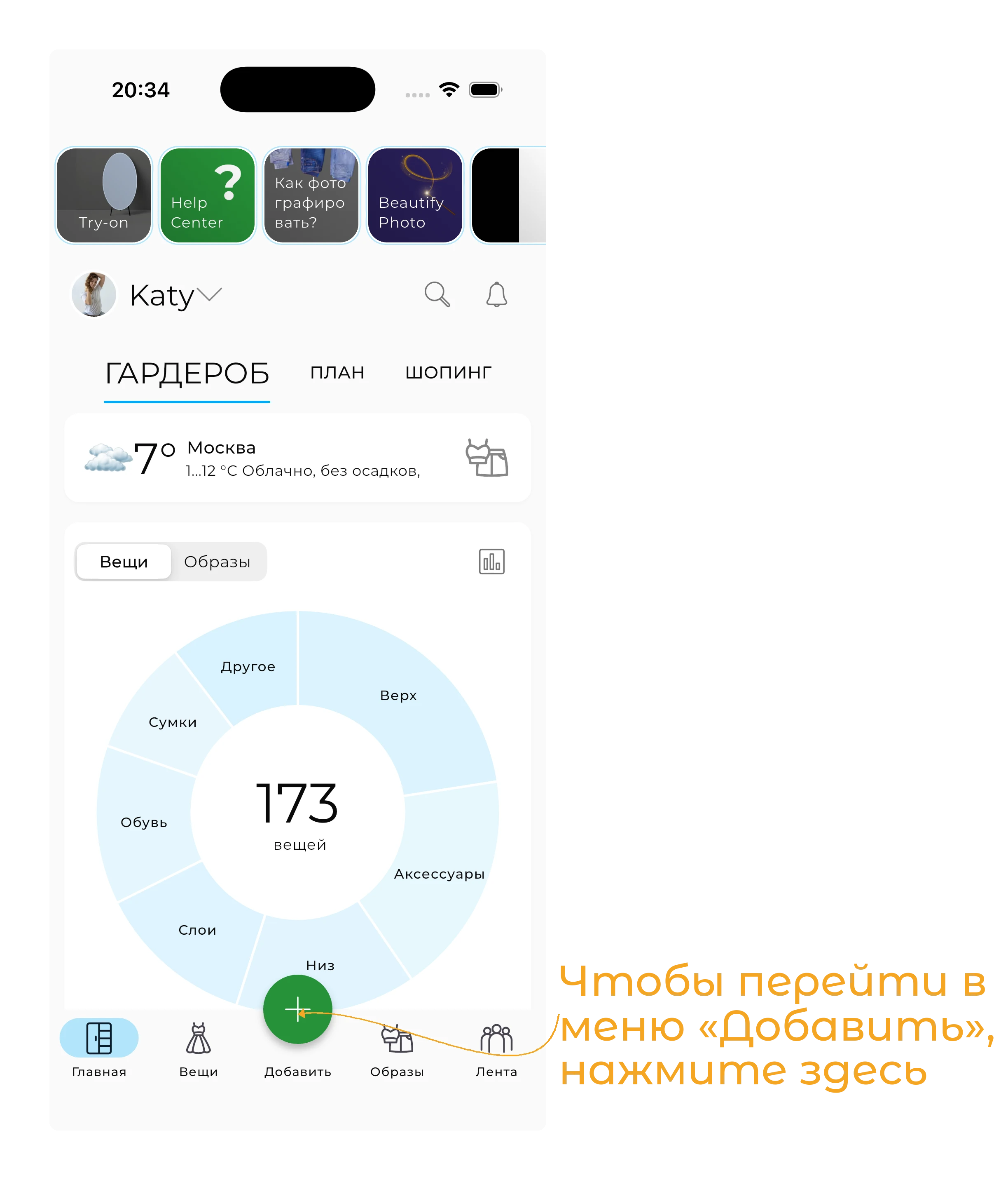 Чтобы начать, нажмите на кнопку «+» в нижней части экрана Гардероба.