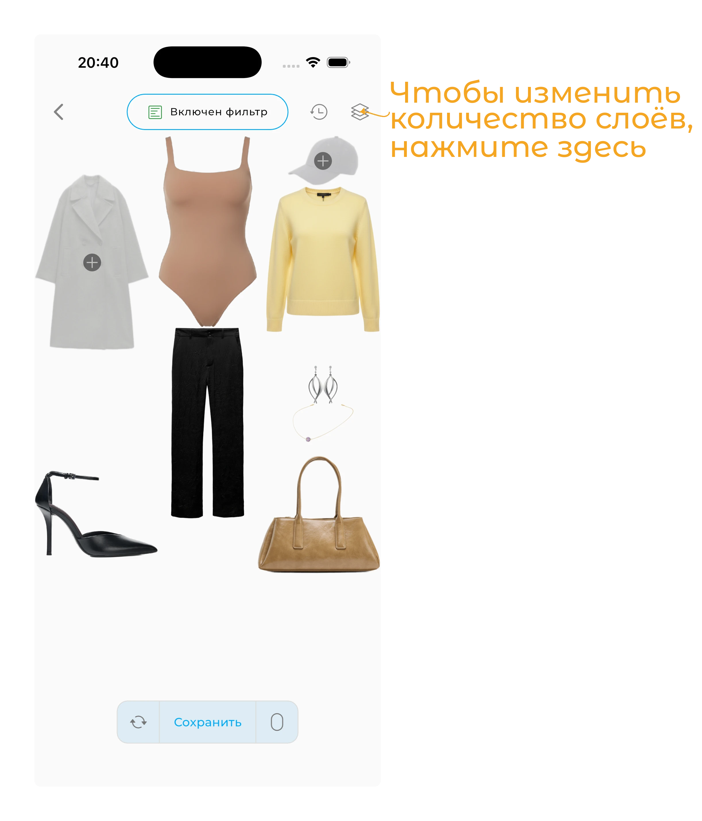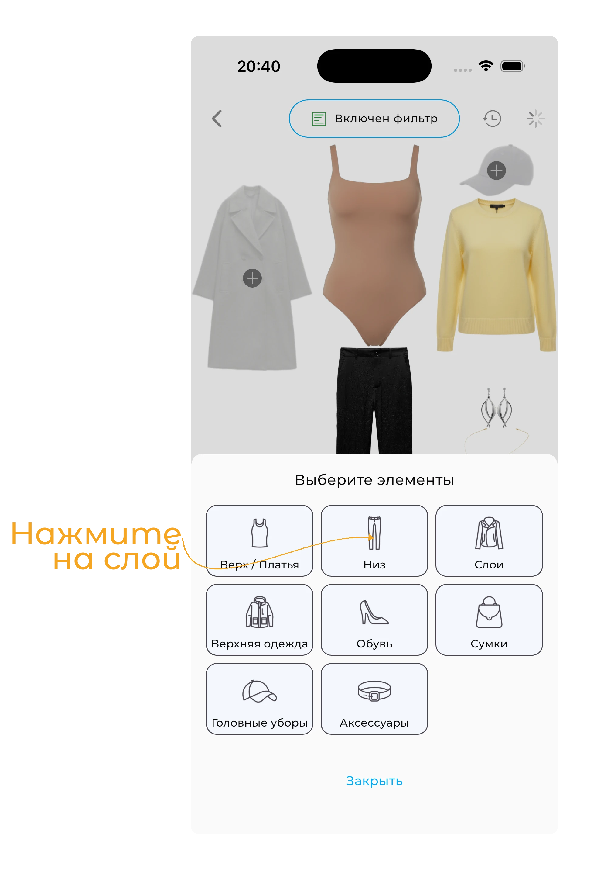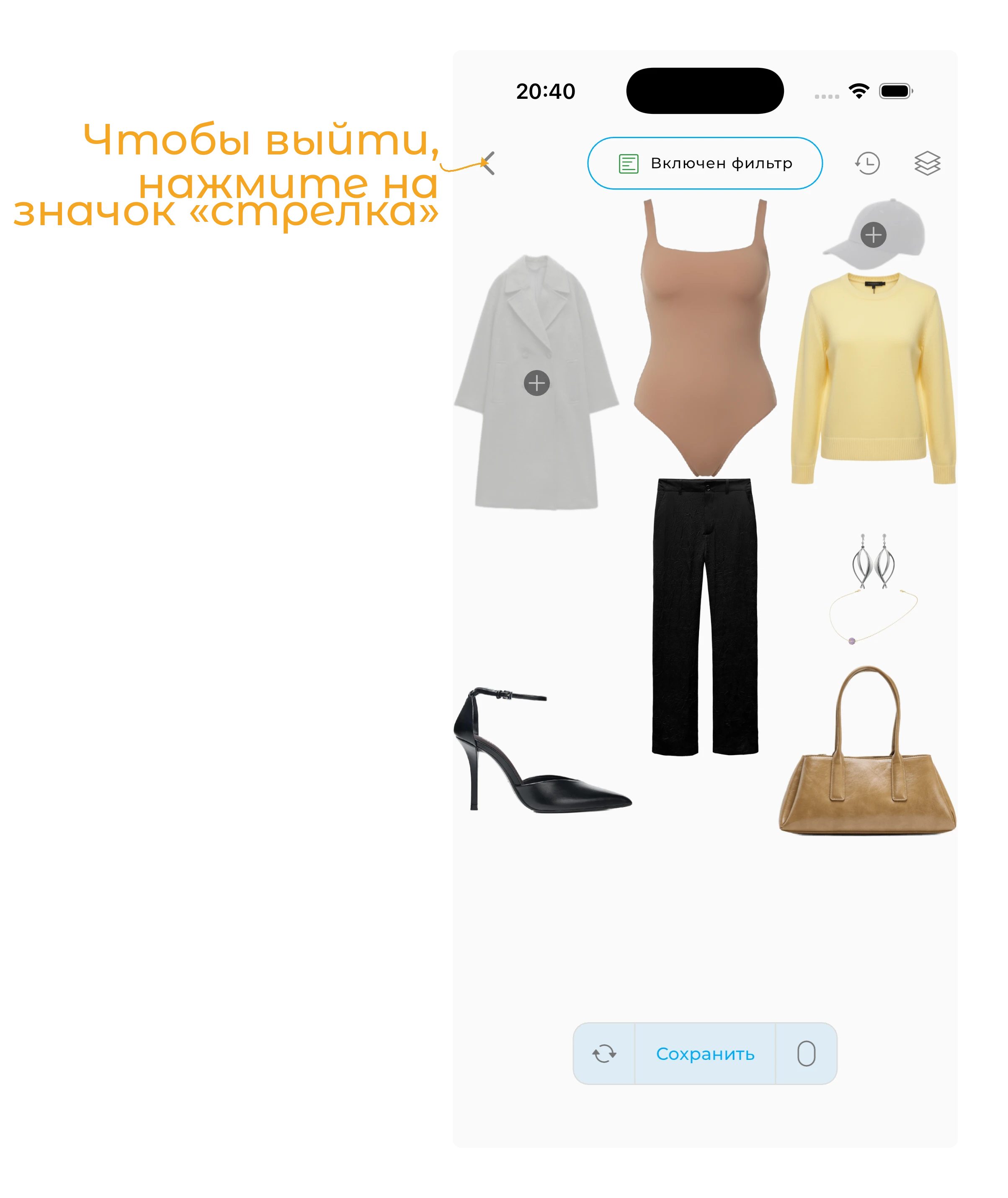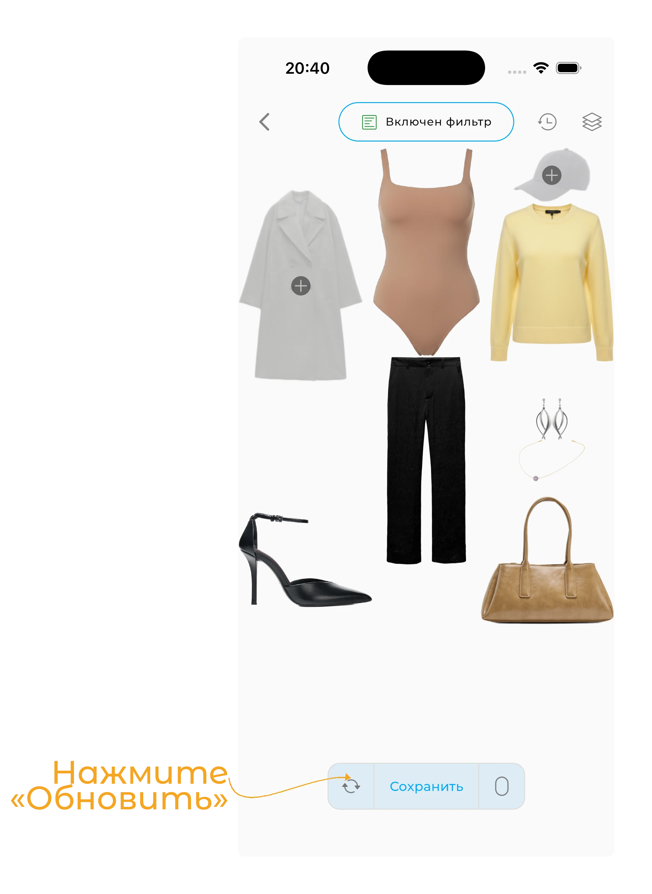 Чтобы начать, нажмите на кнопку «+» в нижней части экрана Гардероба.