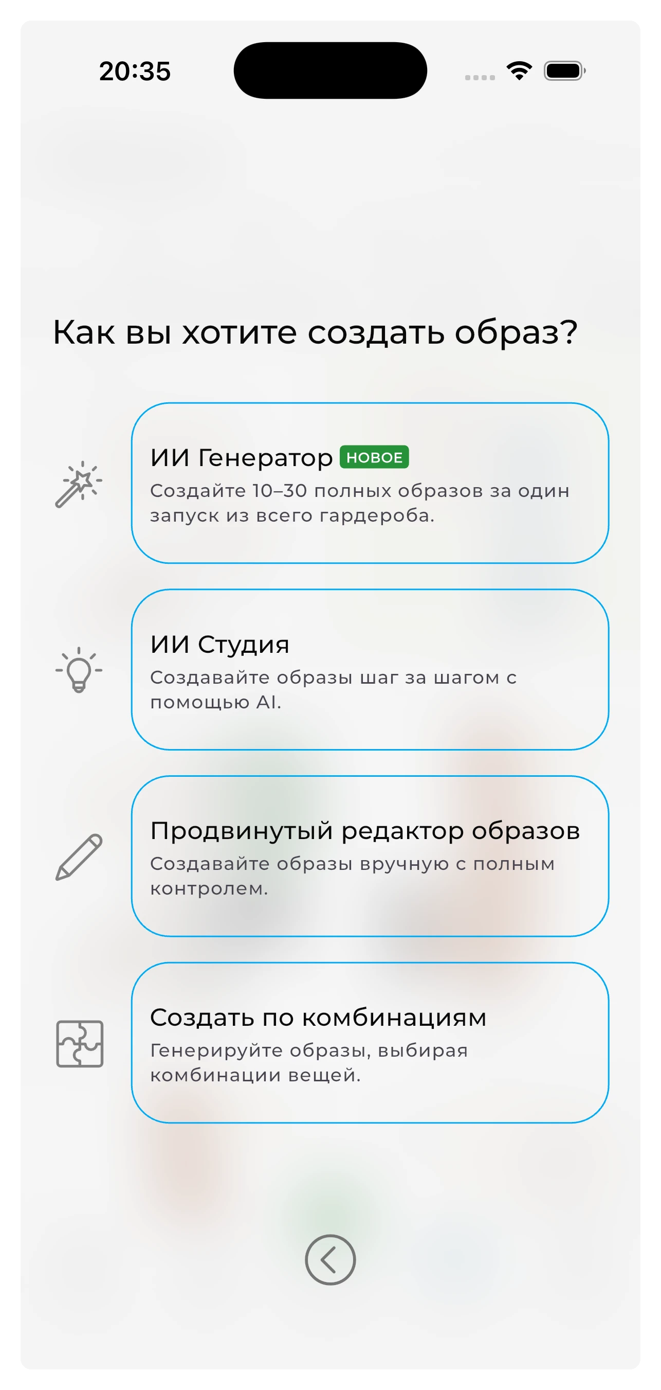 ИИ Генератор Ищете полный набор образов сразу? Попробуйте ИИ Генератор образов — он создаёт 10–30 персонализированных образов за один раз с фильтрами для погоды, повода, стиля и настроения.