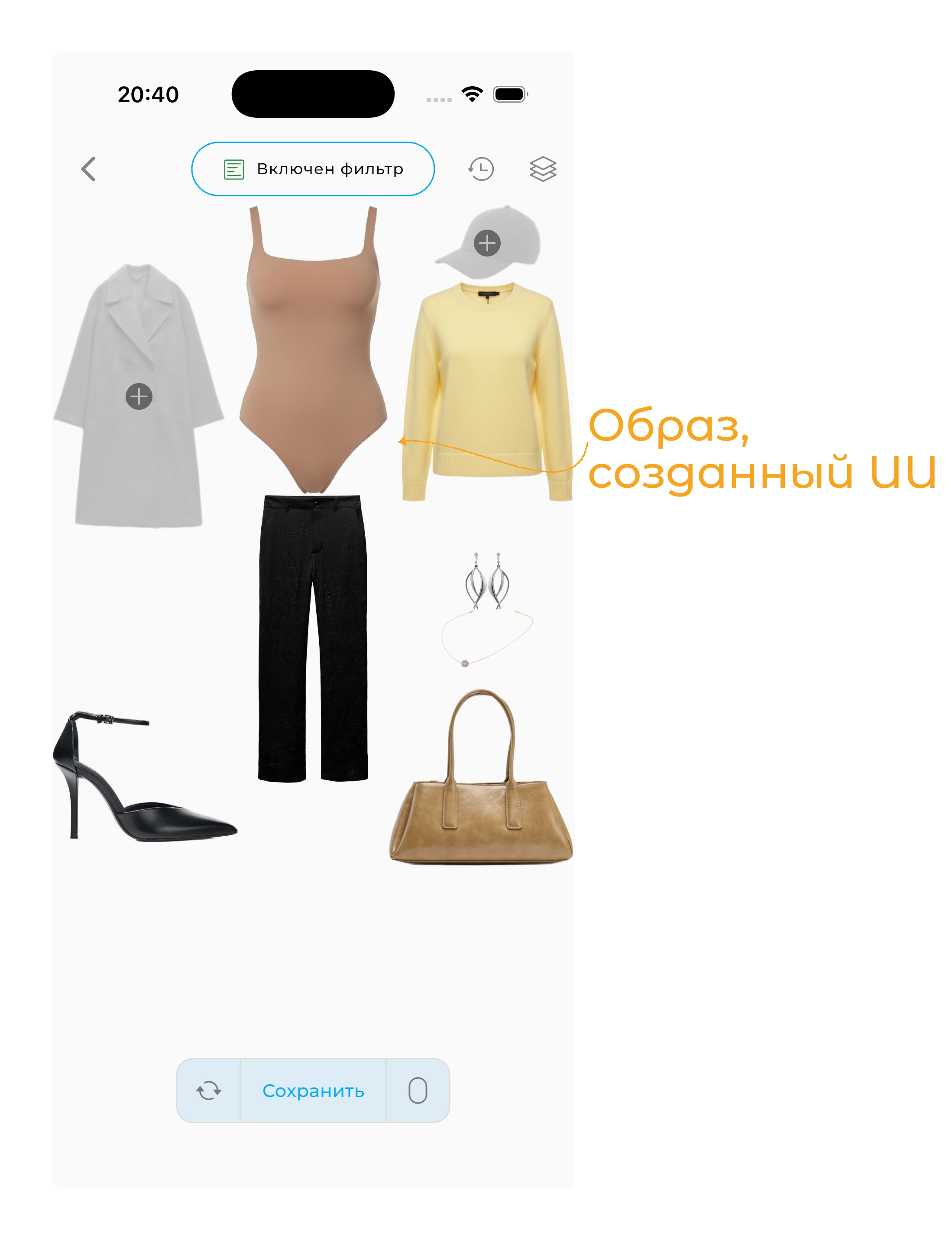 ИИ Студия создаёт один образ за раз из вашего гардероба.