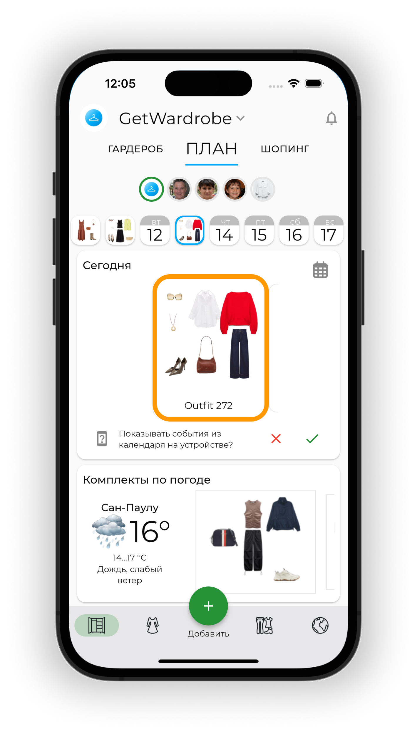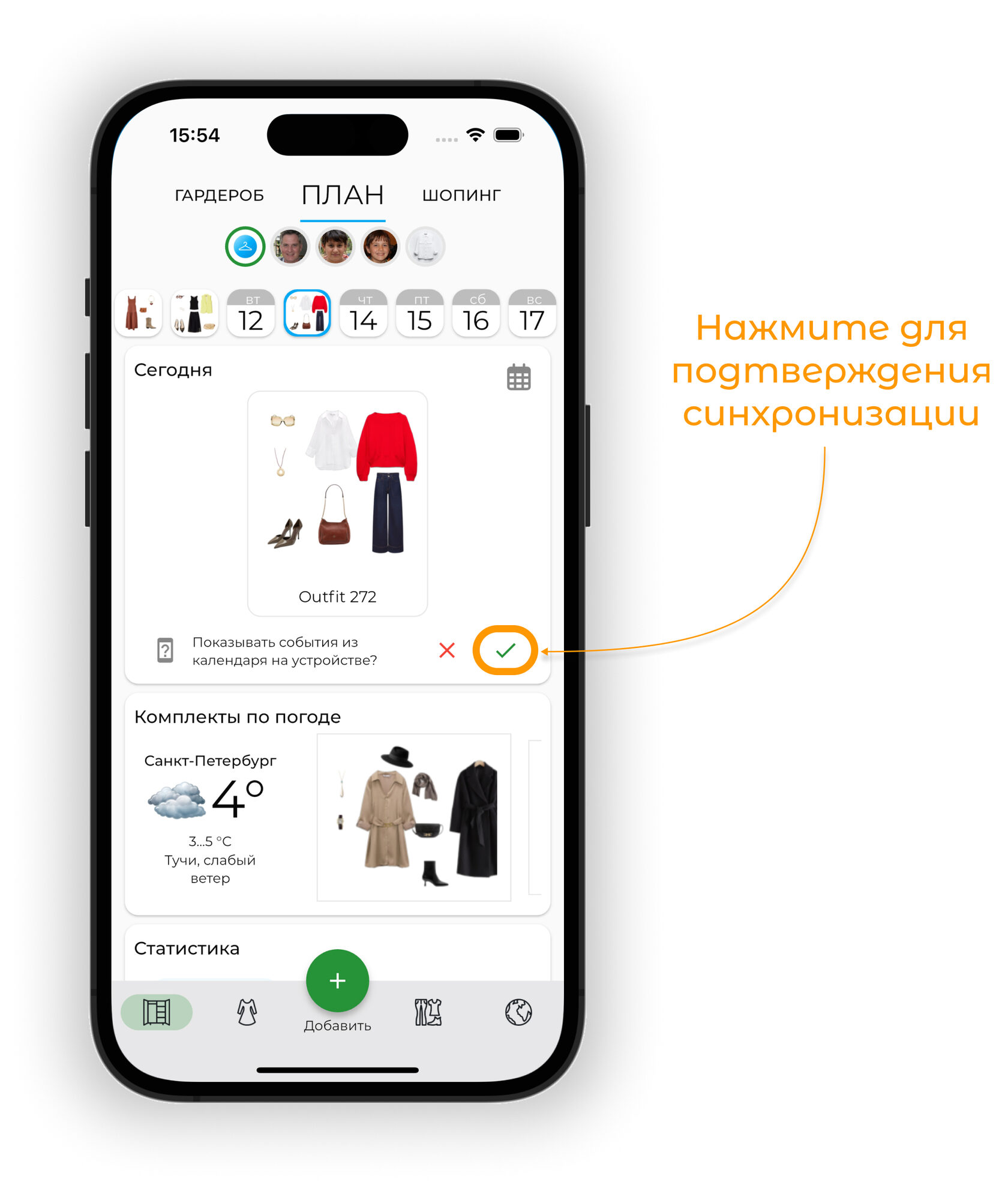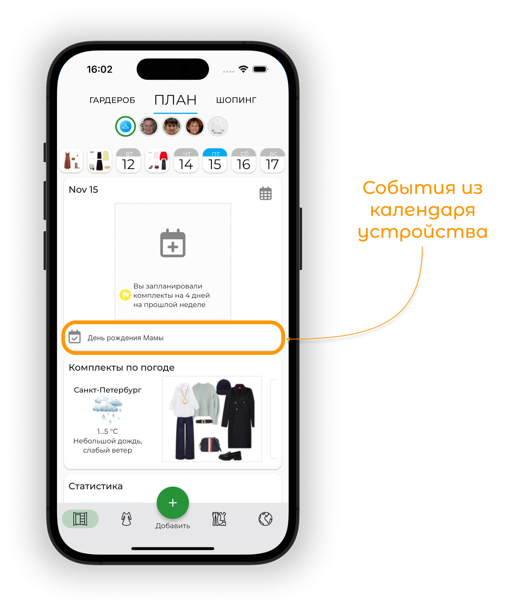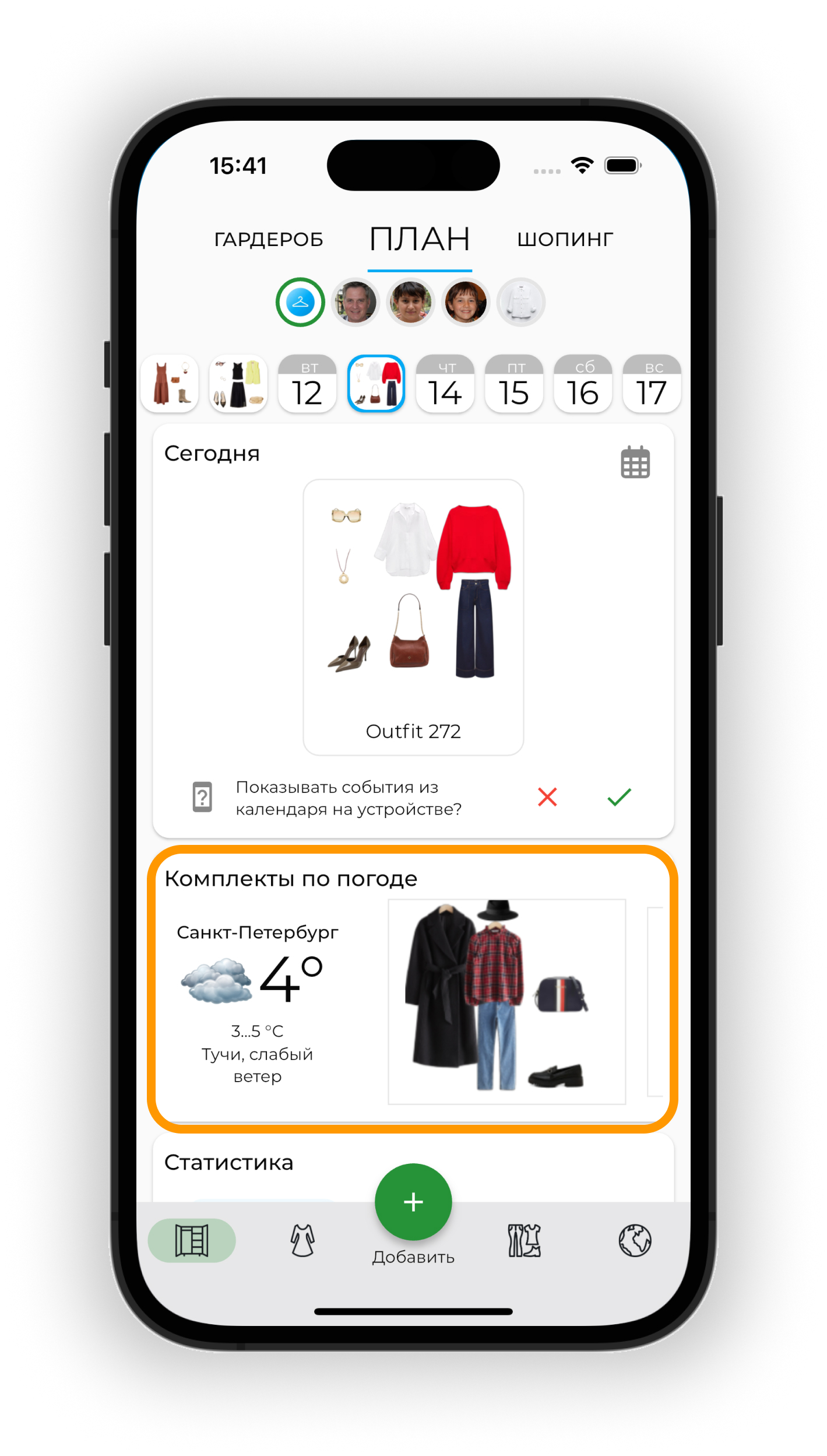 Планируйте образы на будущие даты в календаре. Используйте прогноз погоды для выбора подходящих образов и отслеживайте использование вещей через статистику.