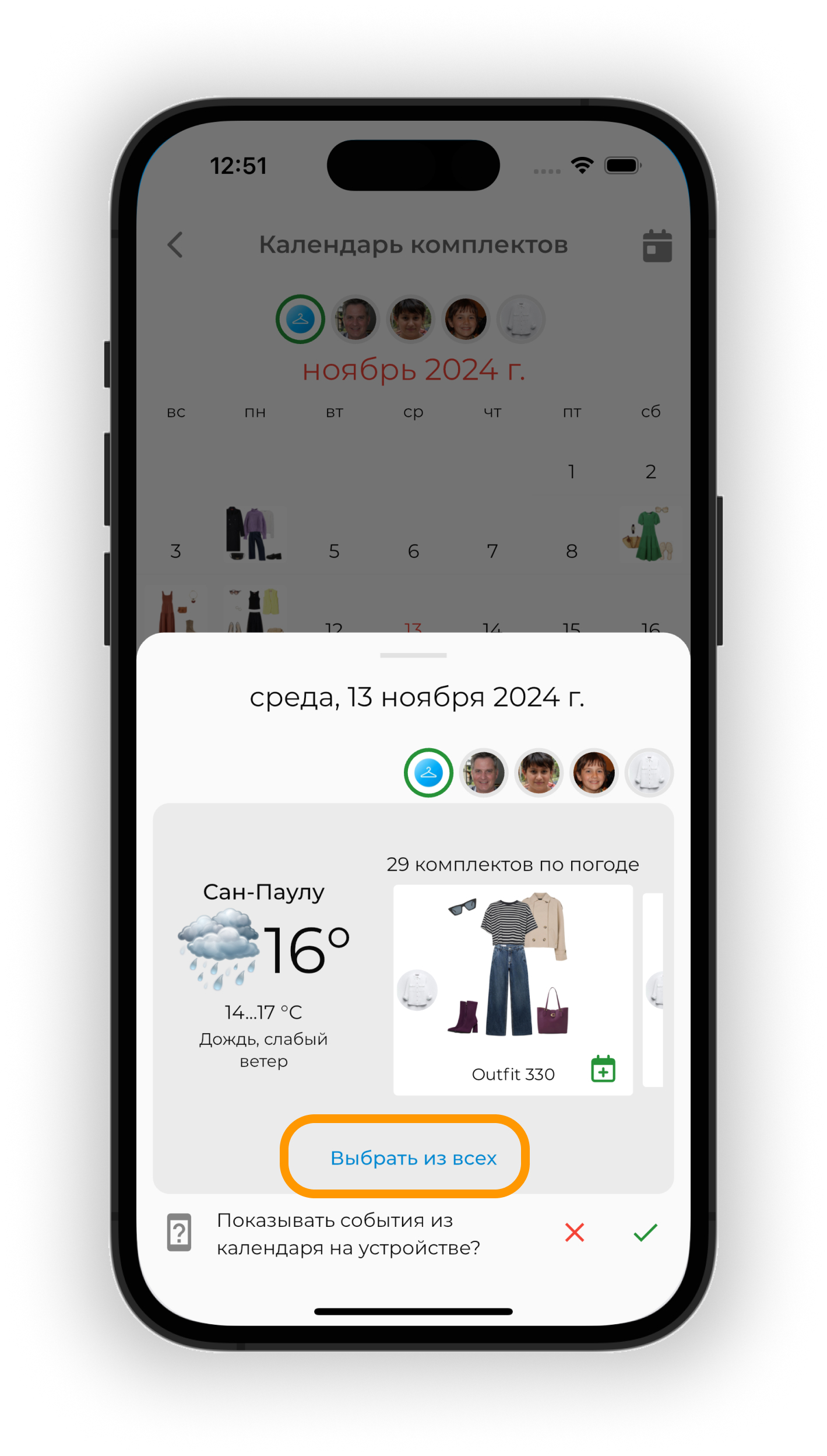Добавьте образ: – нажмите «Выбрать из всех», чтобы открыть список всех образов – или пролистайте образы по погоде и выберите подходящий