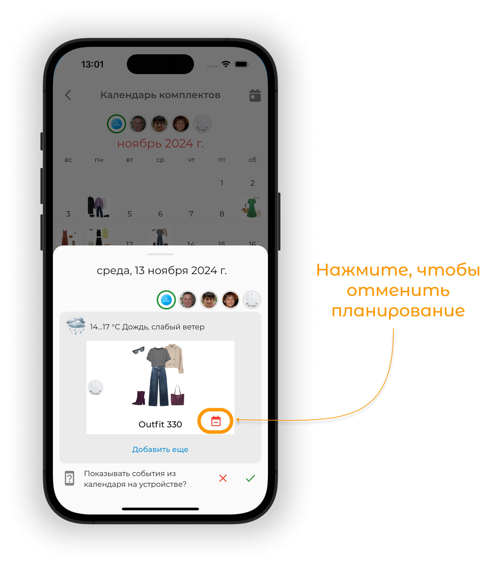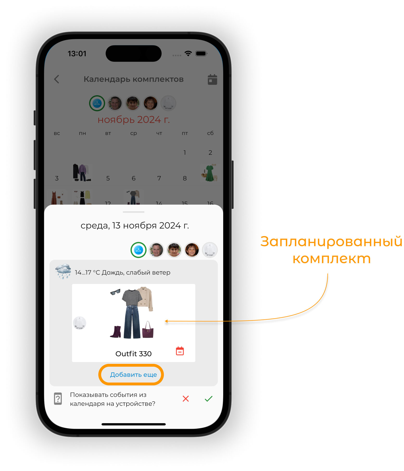 События из календаря телефона отобразятся рядом с запланированными образами.