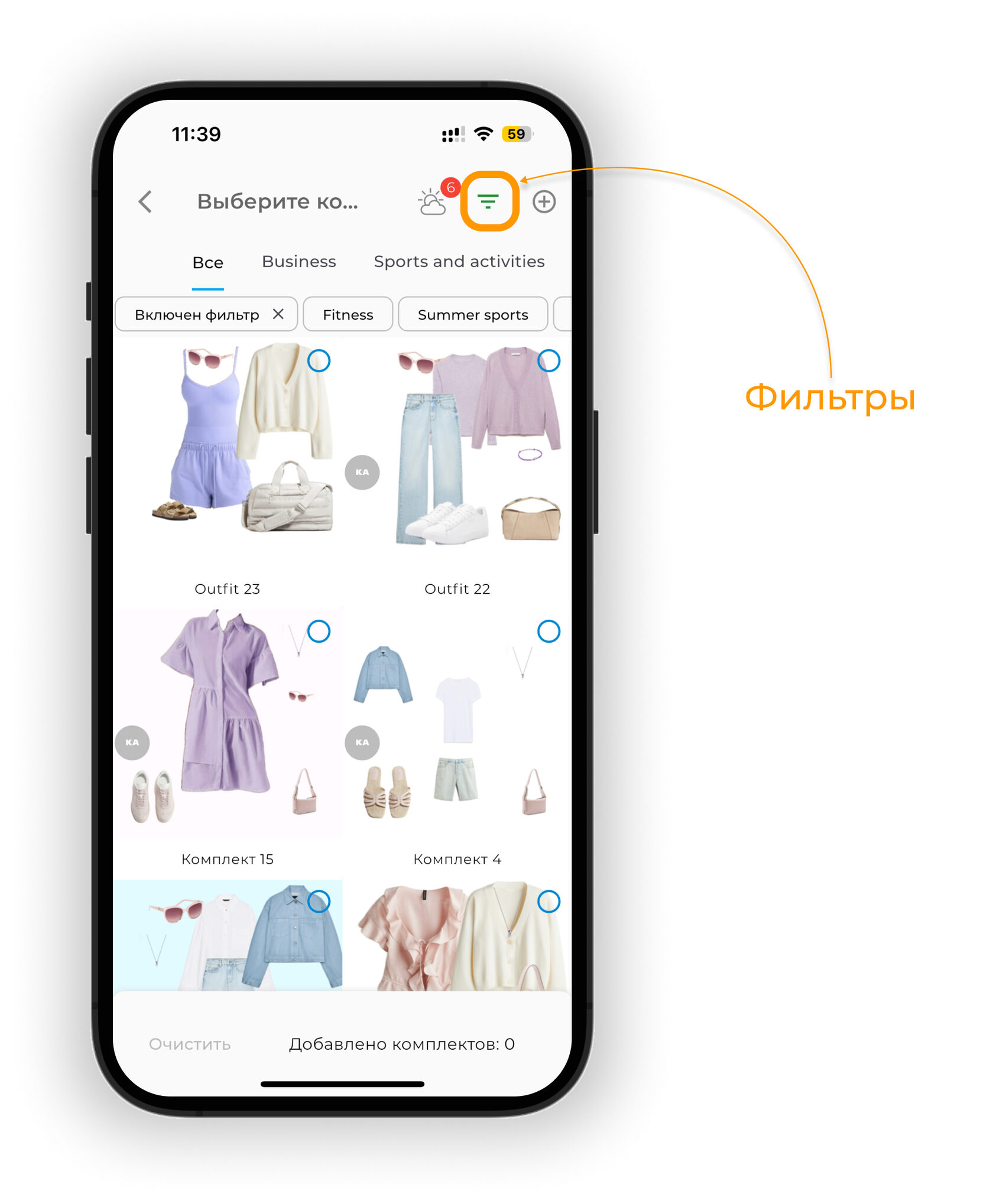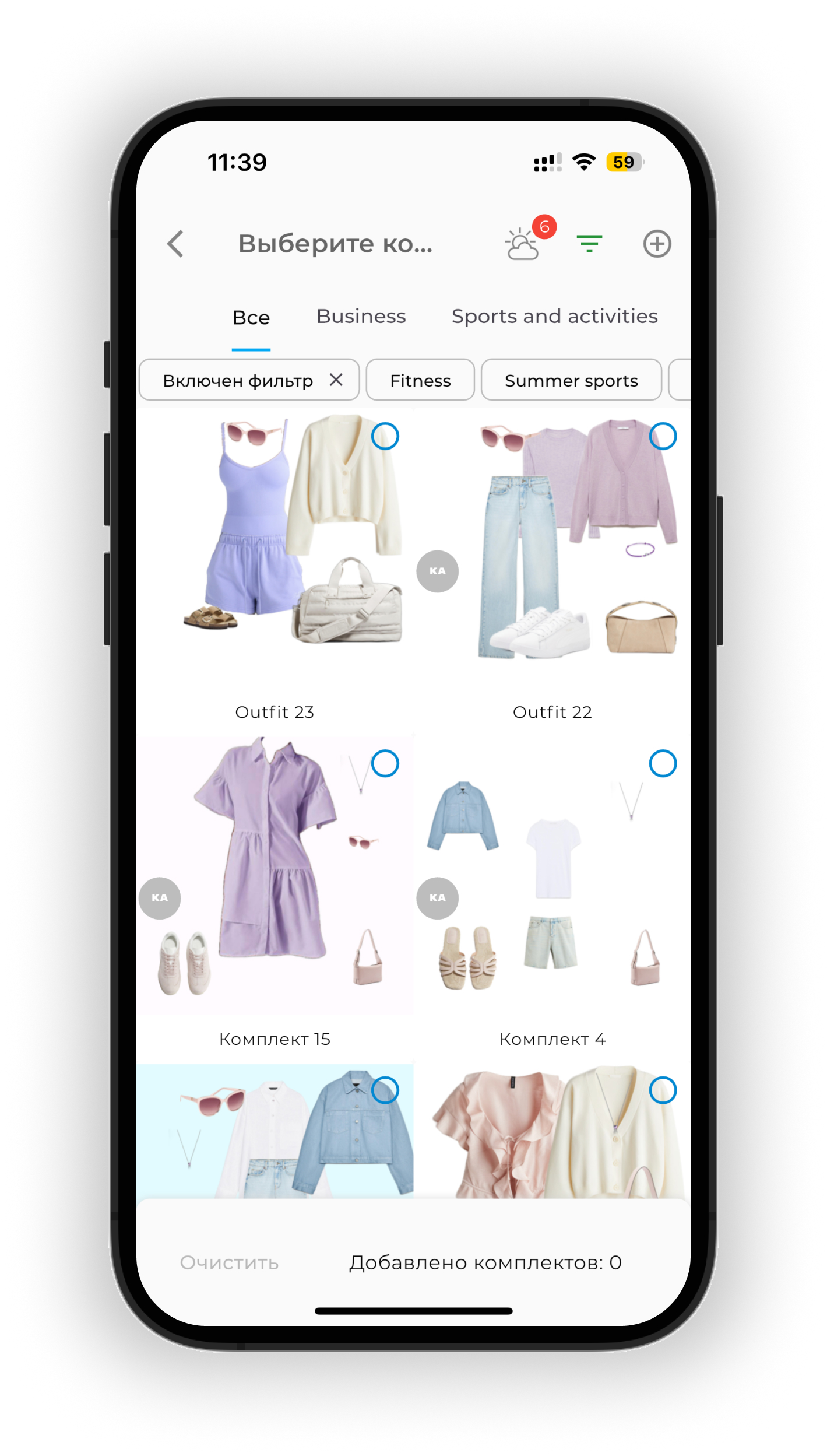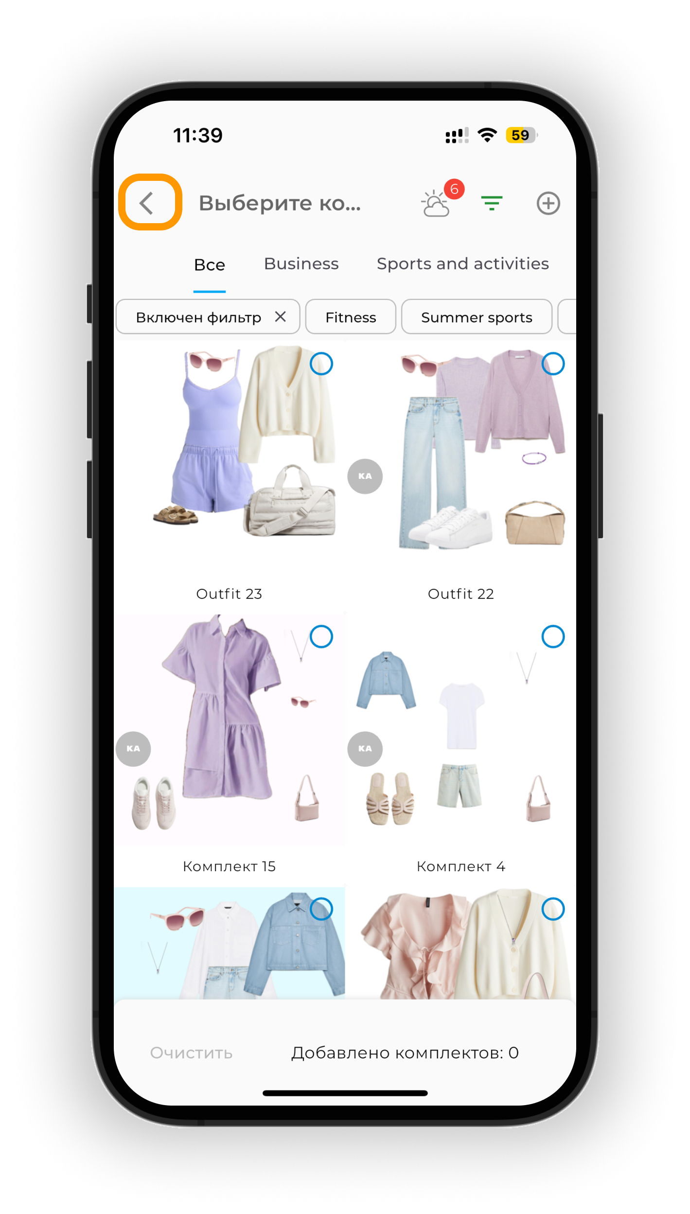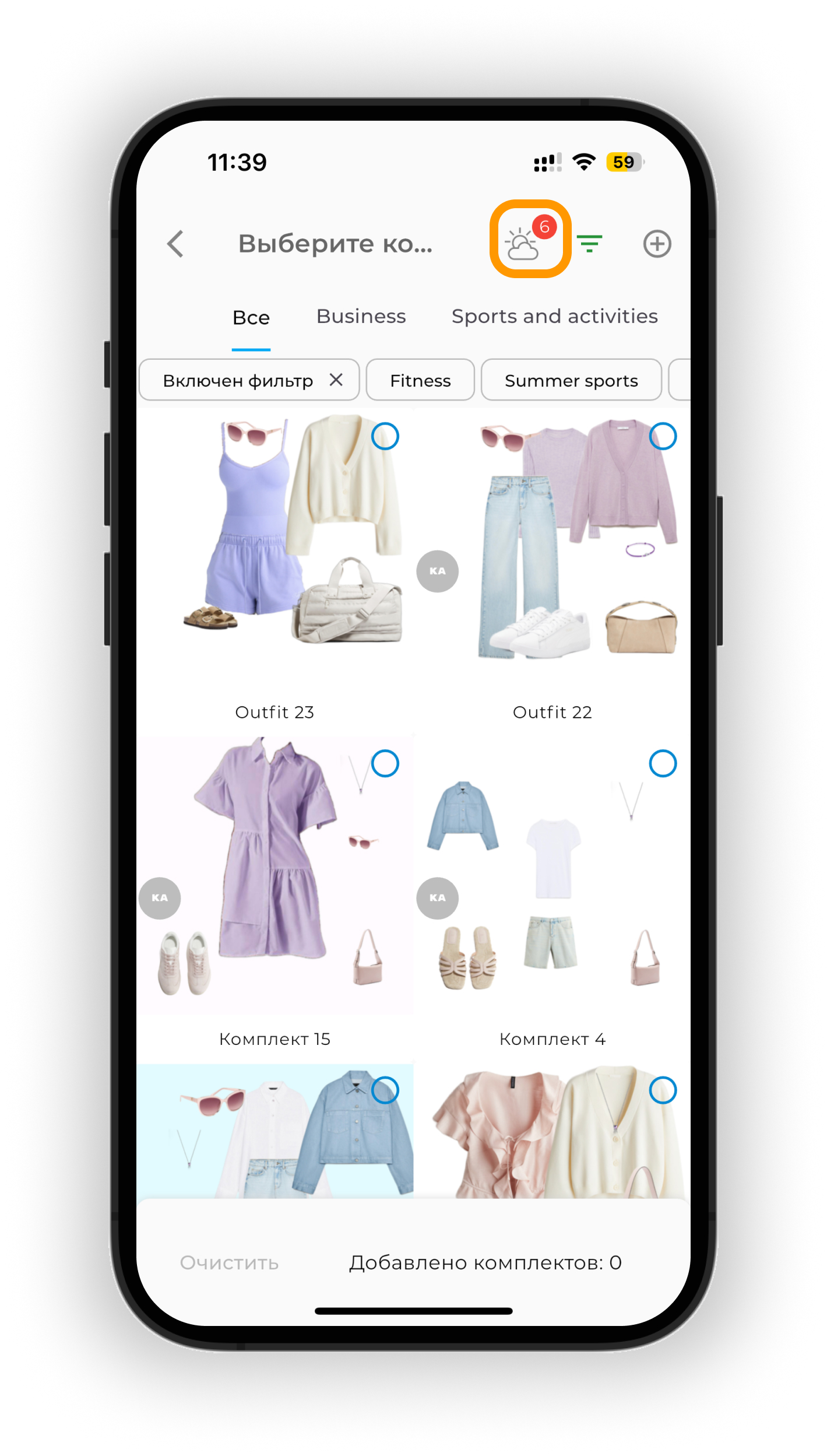 Чтобы отобразить только те образы, которые подходят по погоде, нажмите на иконку облако ☁️. Цифра на иконке показывает, сколько образов доступно на выбранную дату.