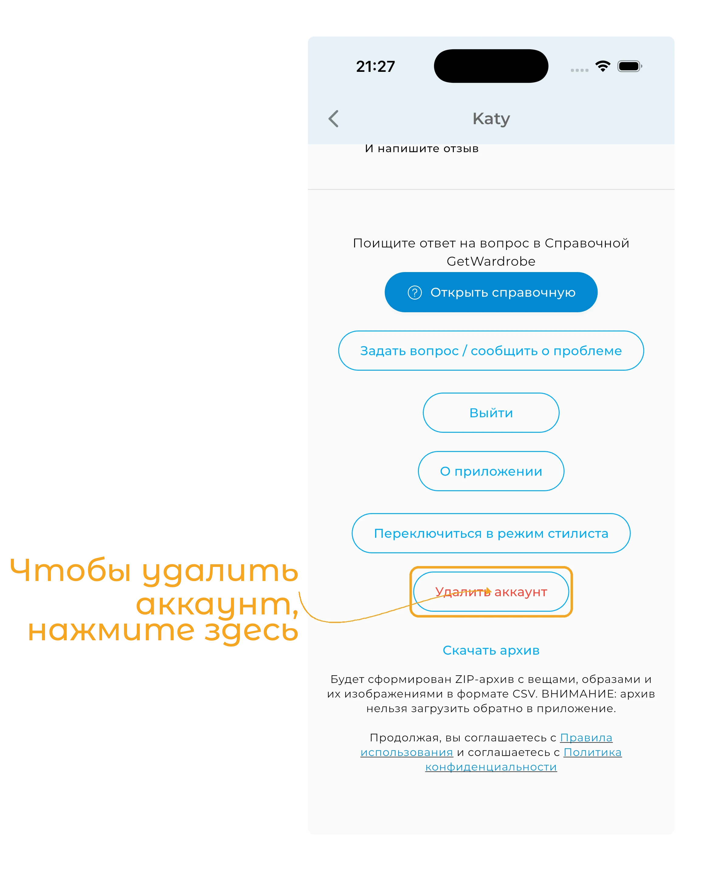 Когда вы удалите аккаунт, все ваши данные будут удалены окончательно. Это включает информацию профиля, Вещи, Образы и списки для поездок. Вы не сможете восстановить ваши данные после удаления аккаунта.