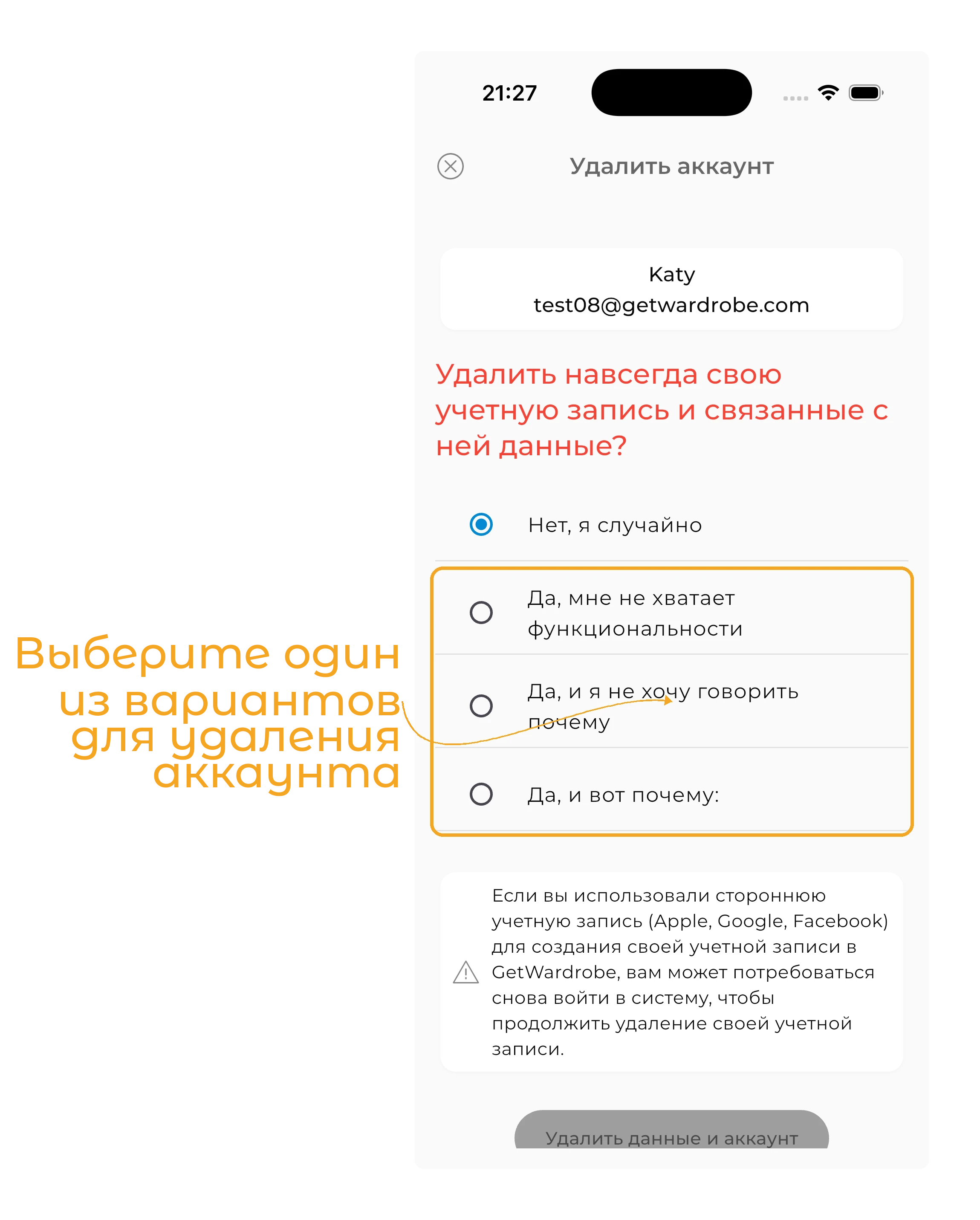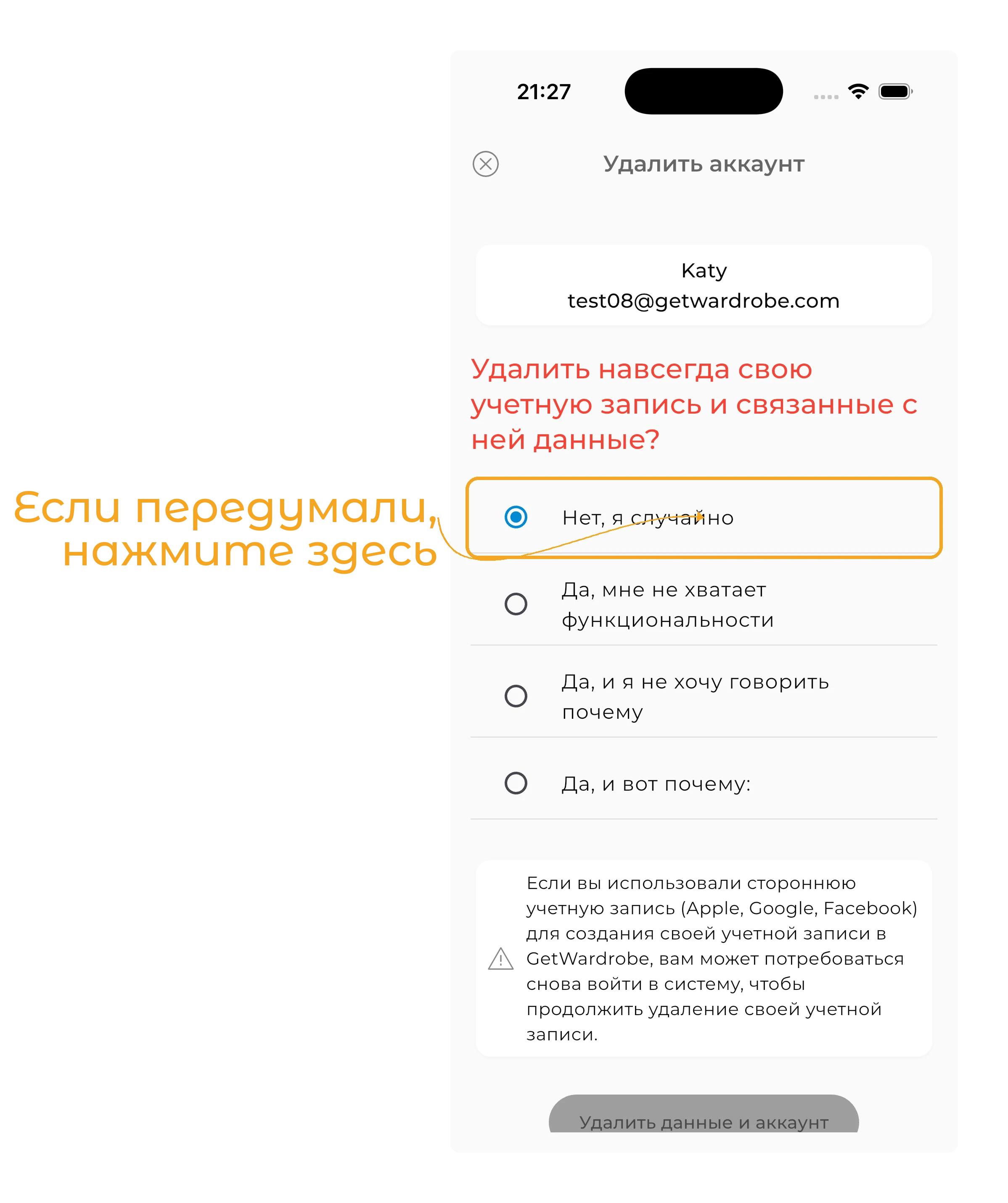 Если вы использовали сторонний аккаунт (Apple, Google, Facebook) для создания учётной записи в GetWardrobe, вам может потребоваться войти снова, чтобы продолжить процесс удаления аккаунта.