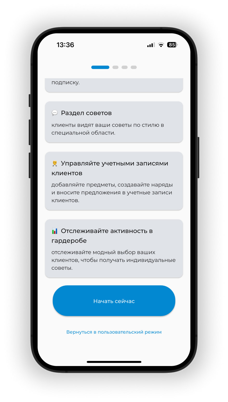 На экране с преимуществами режима стилиста, внизу экрана нажмите «Начать сейчас».
