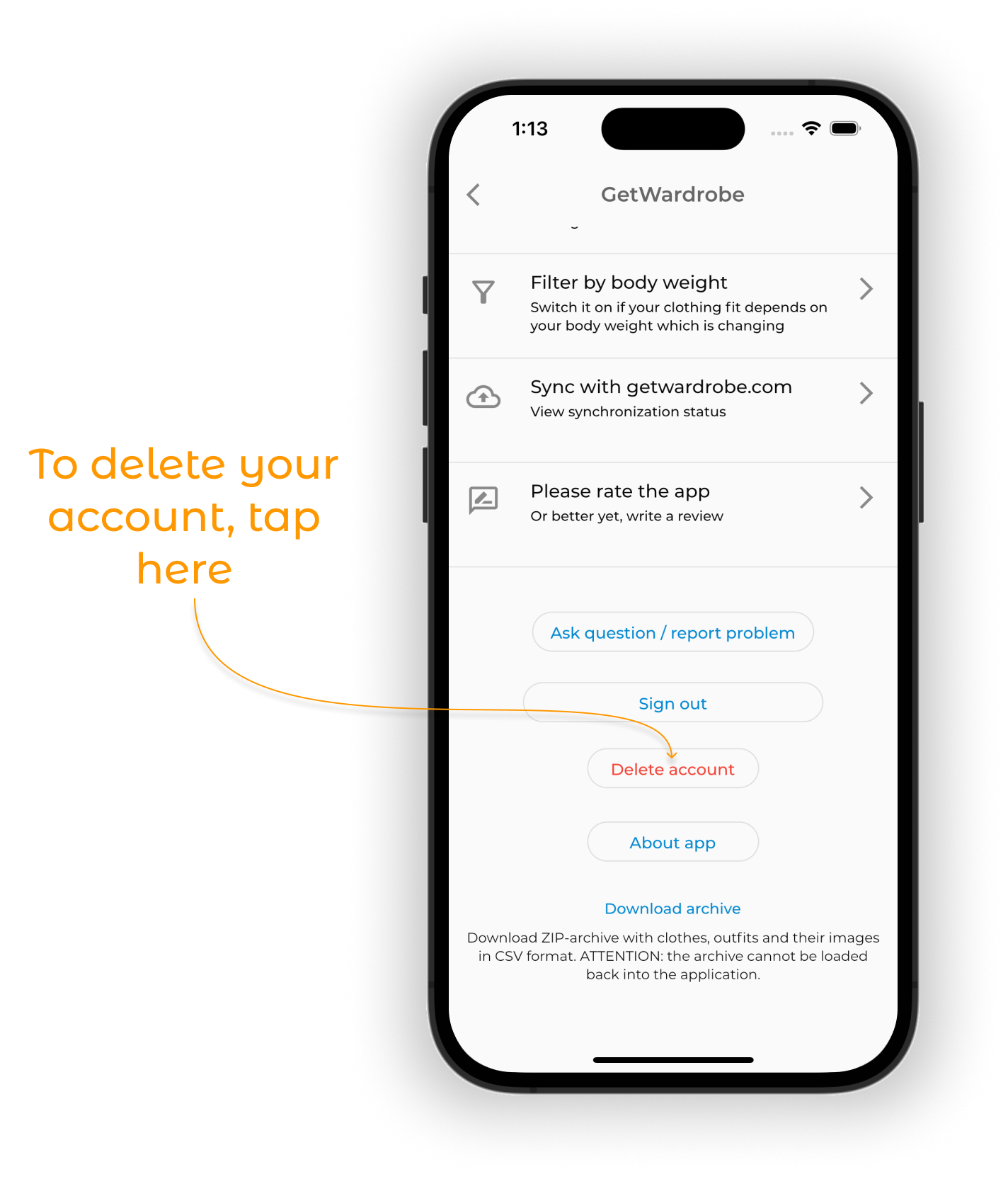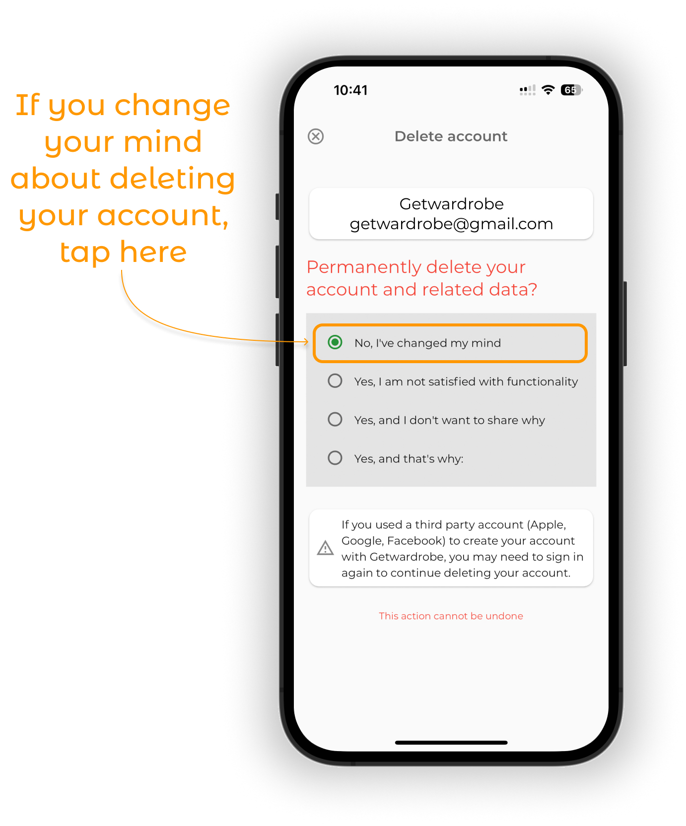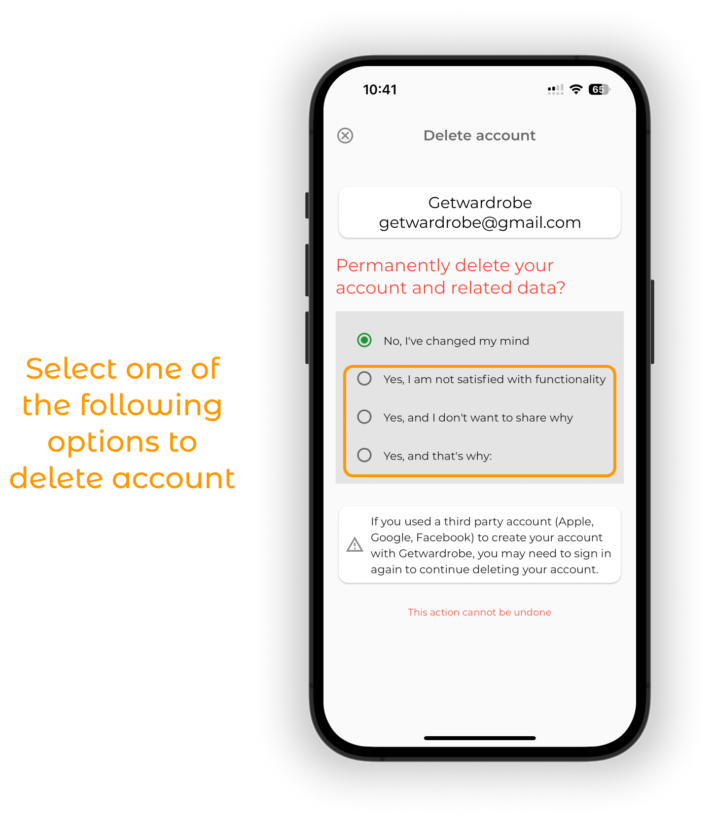 If you used a third-party account (Apple, Google, Facebook) to create your account with Getwardrobe, you may need to sign in again to continue deleting your account.