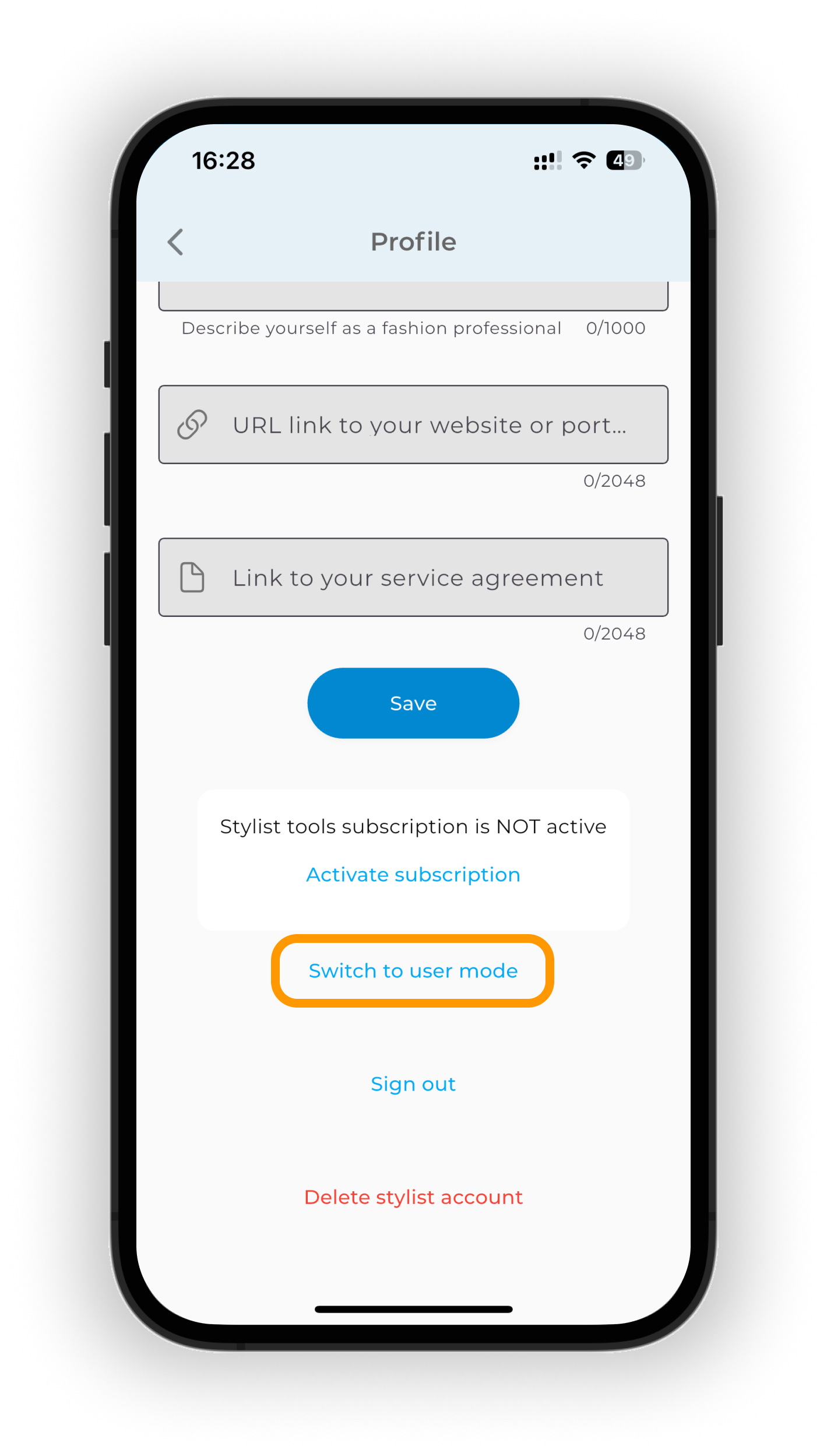 💡 You can switch back to user mode anytime — just go to your Stylist account settings and tap “Switch to user mode” at the bottom of the Profile screen.