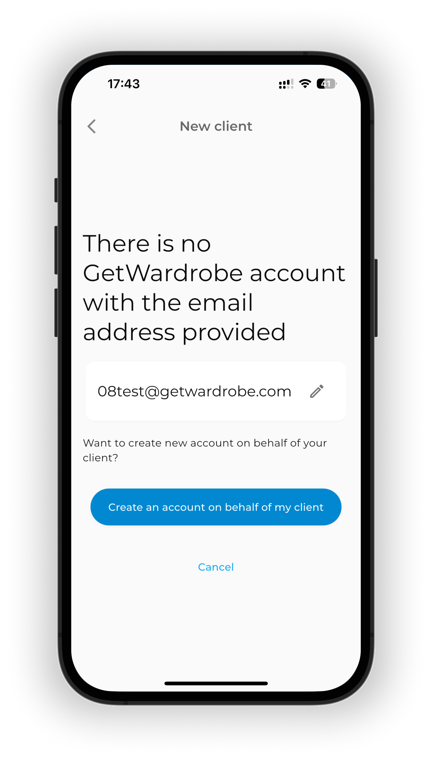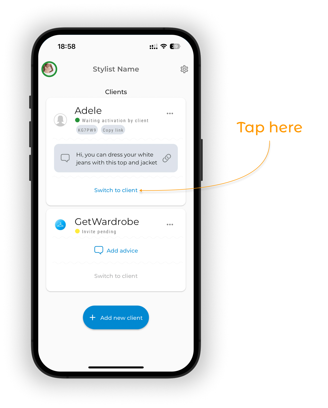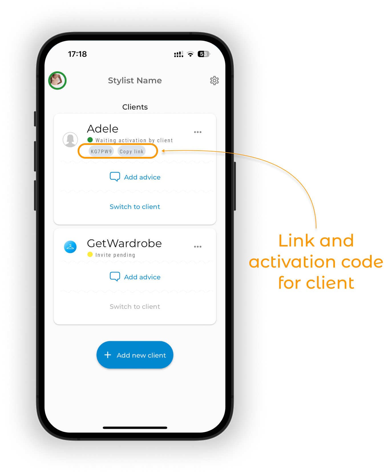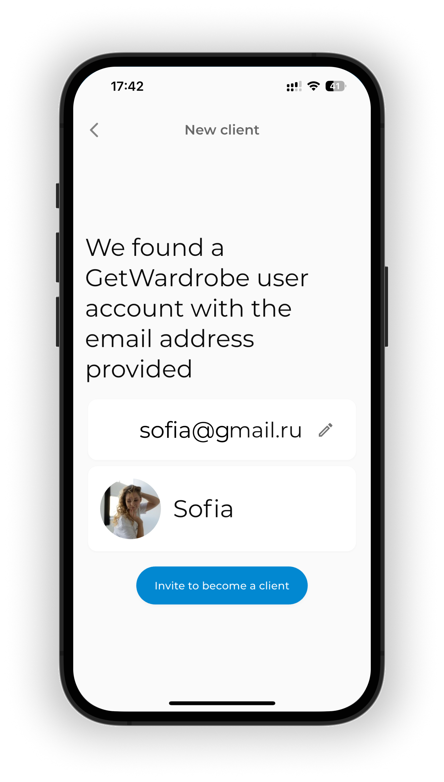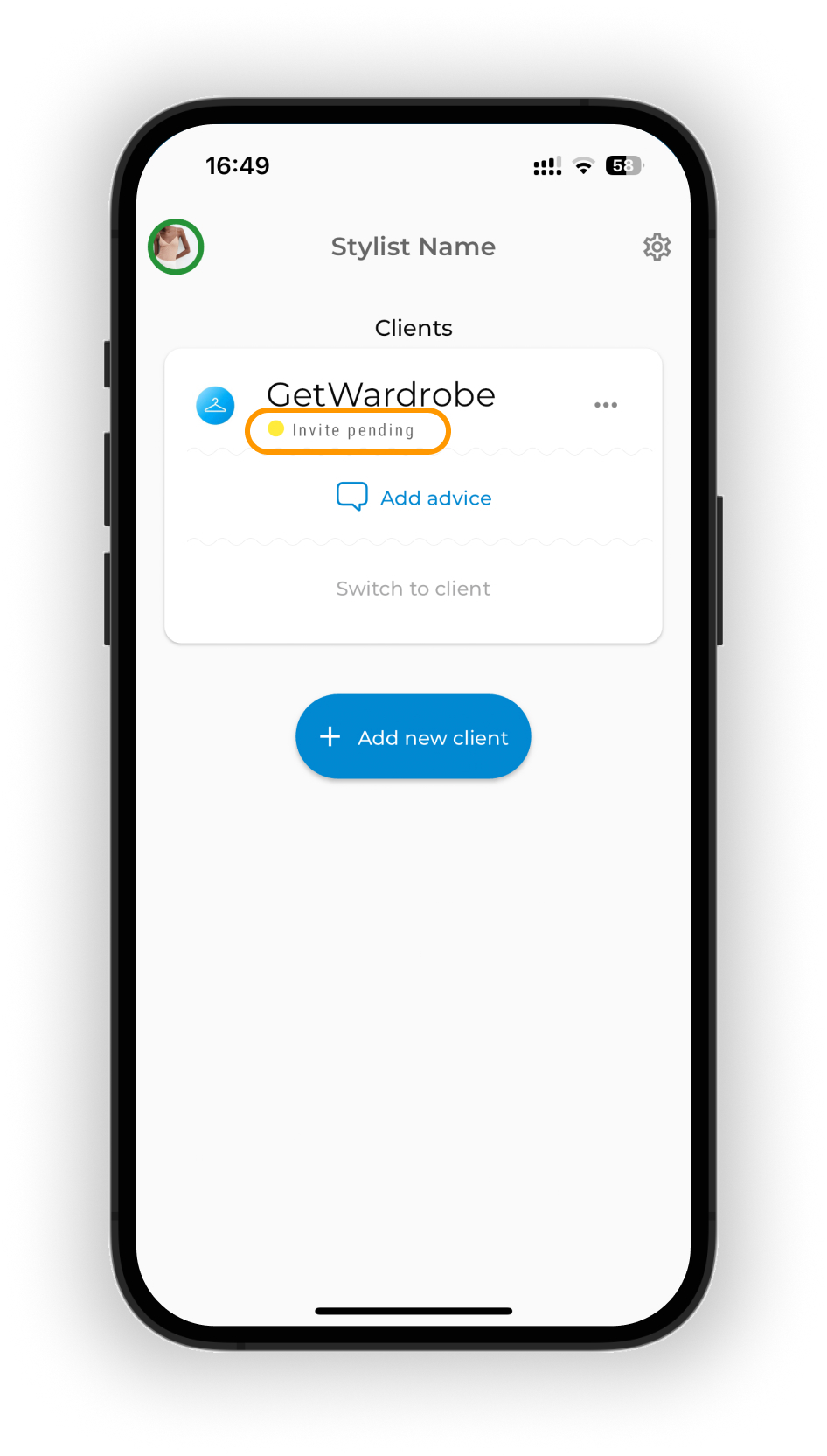 You’ll see the status “Invite pending” on the client card until they accept your invite. Once the client accepts, the status changes to “Accepted,” and you’ll be able to access their wardrobe.