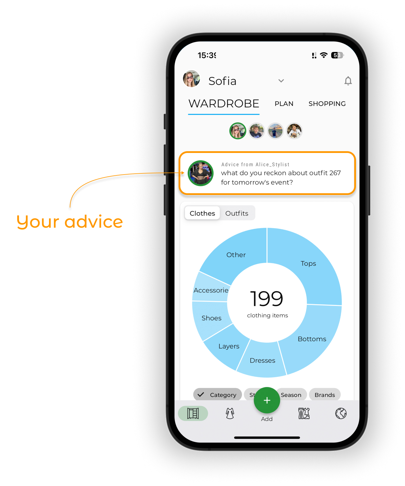 “Advice” section in each client’s wardrobe — leave comments, notes, and personalized style recommendations directly in the app so your client always has easy access to your guidance in one place.